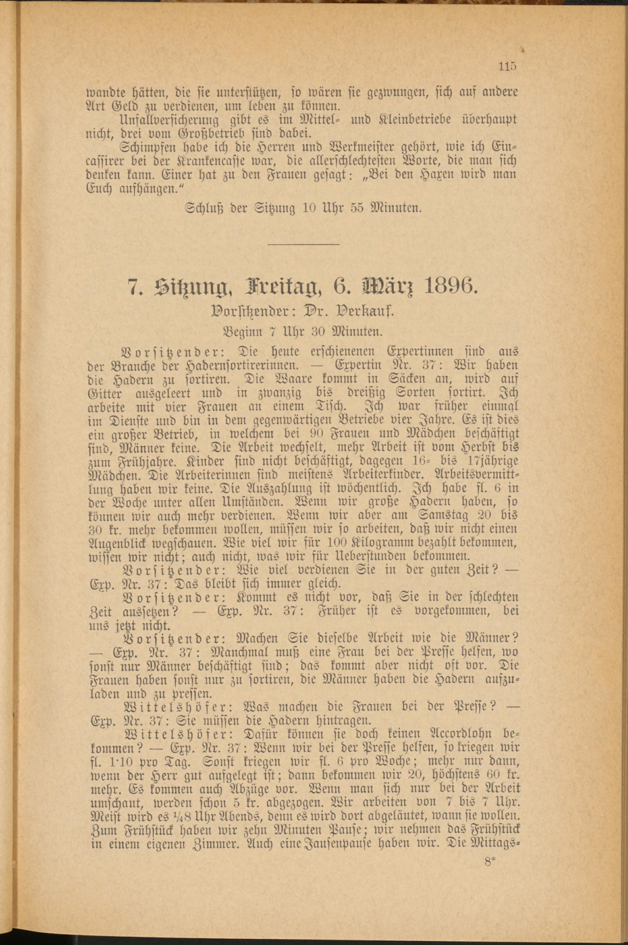 Vorsitzender: Die heute erschienenen Expertinnen sind aus der Branche der Hadernsortirerinnen. — Expertin Nr. 37: Wir haben die Hadern zu sbrtiren. Die Waare kommt in Säcken an, wird aus Gitter ausgeleert und in zwanzig bis dreißig Sorten sortirt. Ich arbeite mit vier Frauen an einem Tisch. Ich war früher einmal im Dienste und bin in dem gegenwärtigen Betriebe vier Jahre. Es ist dies ein großer Betrieb, in welchem bei 90 Frauen und Mädchen beschäftigt sind, Männer keine. Die Arbeit wechselt, mehr Arbeit ist vom Herbst bis zum Frühjahre. Kinder sind nicht beschäftigt, dagegen 16- bis 17jährige Mädchen. Die Arbeiterinnen sind meistens Arbeiterkinder. Arbeitsvermittlung haben wir keine. Die Auszahlung ist wöchentlich. Ich habe fl. 6 in der Woche unter allen Umständen. Wenn wir große Hadern haben, so können wir auch mehr verdienen. Wenn wir aber am Samstag 20 bis 30 kr. mehr bekommen wollen, müssen wir so arbeiten, daß wir nicht einen Augenblick Wegschauen. Wie viel wir für 100 Kilogramm bezahlt bekommen, wissen wir nicht; auch nicht, was wir für Ueberstunden bekommen.