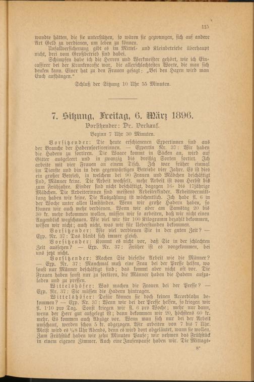Vorsitzender: Machen Sie dieselbe Arbeit wie die Männer? — Exp. Nr. 37: Manchmal muß eine Frau bei der Presse helfen, wo sonst nur Männer beschäftigt sind; das kommt aber nicht oft vor. Die Frauen haben sonst nur zu sortiren, die Männer haben die Hadern auszuladen und zu pressen.