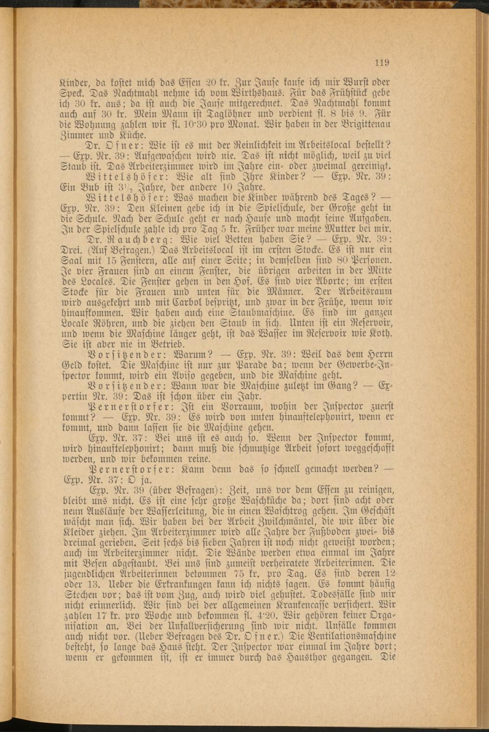 Dr. Ofner: Wie ist es mit der Reinlichkeit im Arbeitslocal bestellt? — Exp. Nr. 39: Ausgewaschen wird nie. Das ist nicht möglich, weil zu viel Staub ist. Das Arbeiterzimmer wird im Jahre ein- oder zweimal gereinigt.