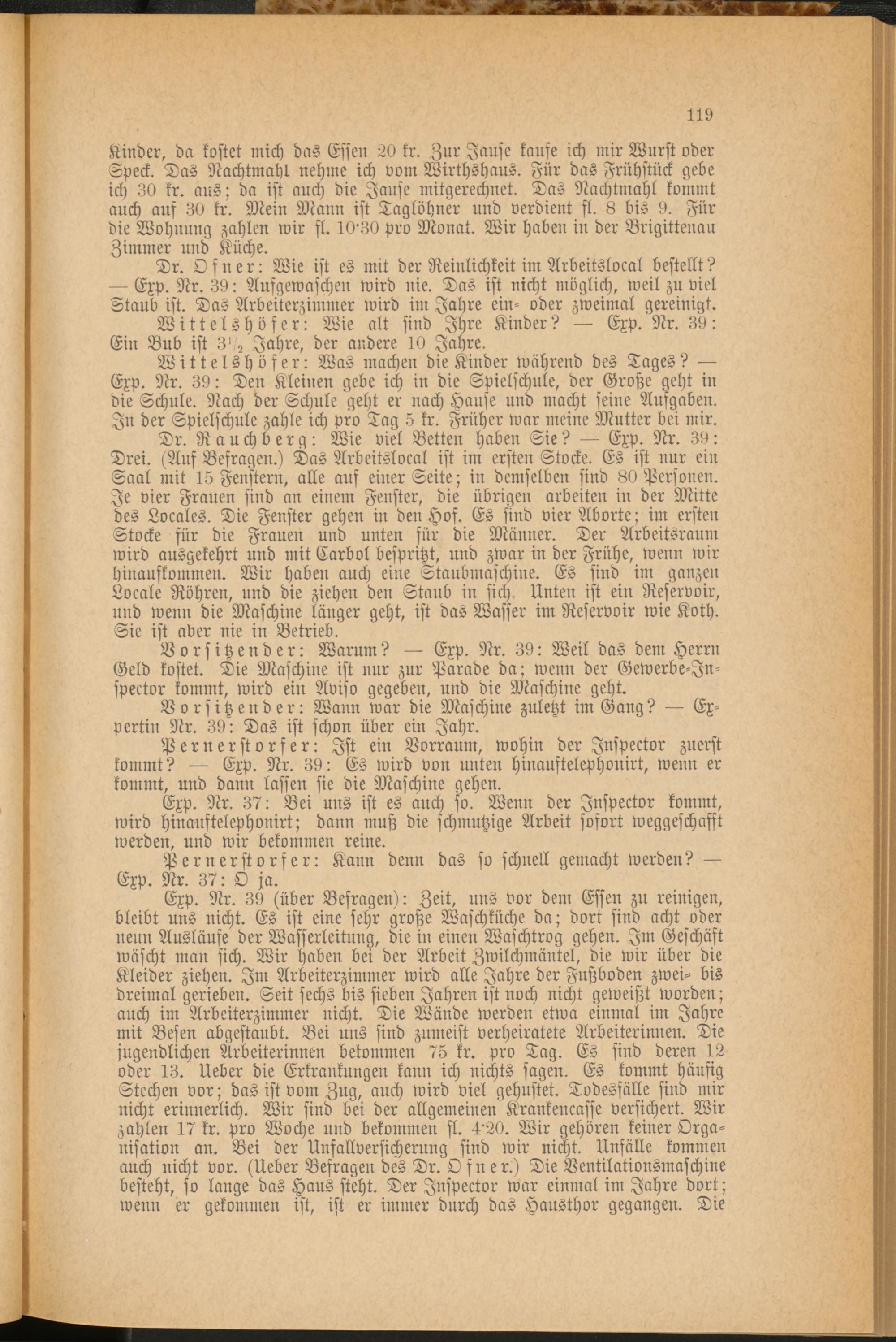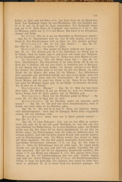 Exp. Nr. 39 (über Befragen): Zeit, uns vor dem Essen zu reinigen, bleibt uns nicht. Es ist eine sehr große Waschküche da; dort sind acht oder neun Ausläufe der Wasserleitung, die in einen Waschtrog gehen. Im Geschäft wäscht man sich. Wir haben bei der Arbeit Zwilchmäntel, die wir über die Kleider ziehen. Im Arbeiterzimmer wird alle Jahre der Fußboden zwei- bis dreimal gerieben. Seit sechs bis sieben Jahren ist noch nicht geweißt worden; auch im Arbeiterzimmer nicht. Die Wände werden etwa einmal im Jahre mit Besen abgestaubt. Bei uns sind zumeist verheiratete Arbeiterinnen. Die jugendlichen Arbeiterinnen bekommen 75 kr. pro Tag. Es sind deren 12 oder 13. Ueber die Erkrankungen kann ich nichts sagen. Es kommt häufig Stechen vor; das ist vom Zug, auch wird viel gehustet. Todesfälle sind mir nicht erinnerlich. Wir sind bei der allgemeinen Krankenkasse versichert. Wir zahlen 17 kr. pro Woche und bekommen fl. 4'20. Wir gehören keiner Organisation an. Bei der Unfallversicherung sind wir nicht. Unfälle kommen auch nicht vor. (Ueber Befragen des Dr. O f n e r.) Die Ventilationsmaschine besteht, fo lange das Haus steht. Der Jnspector war einmal im Jahre dort; wenn er gekommen ist, ist er immer durch das Hausthor gegangen. Die