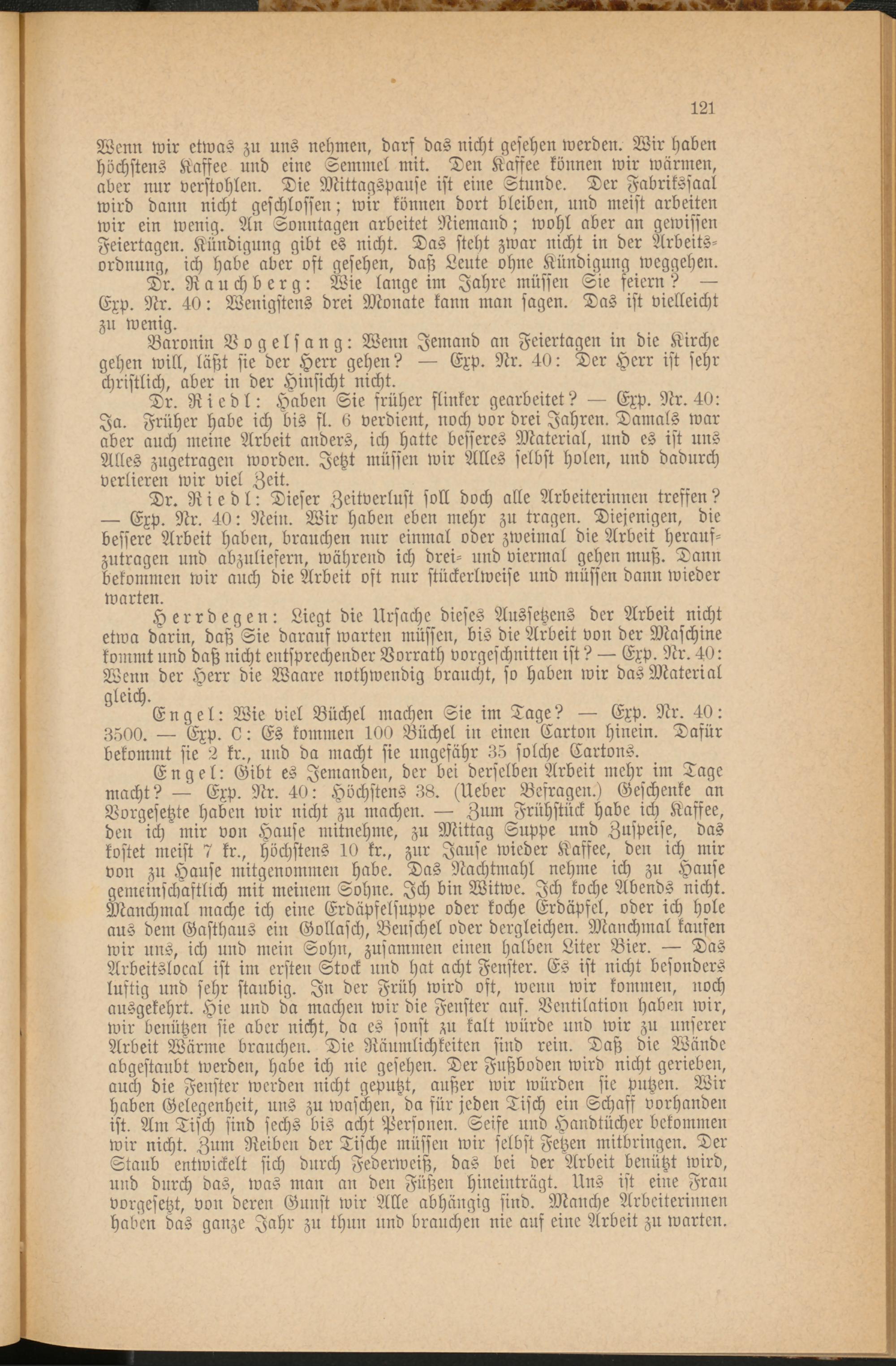 Engel: Gibt es Jemanden, der bei derselben Arbeit mehr im Tage macht? — Exp. Nr. 40: Höchstens 38. (Ueber Befragen.) Geschenke an Vorgesetzte haben wir nicht zu machen. — Zum Frühstück habe ich Kaffee, den ich mir von Hause mitnehme, zu Mittag Suppe und Zuspeise, das kostet meist 7 kr., höchstens 10 kr., zur Jause wieder Kaffee, den ich mir von zu Hause mitgenommen habe. Das Nachtmahl nehme ich zu Hause gemeinschaftlich mit meinem Sohne. Ich bin Witwe. Ich koche Abends nicht. Manchmal mache ich eine Erdüpfelsuppe oder koche Erdäpfel, oder ich hole aus dem Gasthaus ein Gollasch, Beuschel oder dergleichen. Manchmal kaufen wir uns, ich und mein Sohn, zusammen einen halben Liter Bier. — Das Arbeitslocal ist im ersten Stock und hat acht Fenster. Es ist nicht besonders lustig und sehr staubig. Irr der Früh wird oft, wenn wir kommen, noch ausgekehrt. Hie und da machen wir die Fenster auf. Ventilation haben wir, wir benützen sie aber nicht, da es sonst zu kalt würde und wir zu unserer Arbeit Wärme brauchen. Die Räumlichkeiten sind rein. Daß die Wände abgestaubt werden, habe ich nie gesehen. Der Fußboden wird nicht gerieben, auch die Fenster werden nicht geputzt, außer wir würden sie putzen. Wir haben Gelegenheit, uns zu waschen, da für jeden Tisch ein Schafs vorhanden ist. Am Tisch sind sechs bis acht Personen. Seife und Handtücher bekommen wir nicht. Zum Reiben der Tische müssen wir selbst Fetzen mitbringen. Der Staub entwickelt sich durch Federweiß, das bei der Arbeit benützt wird, und durch das, was man an den Füßen hineinträgt. Uns ist eine Frau vorgesetzt, von deren Gunst wir Alle abhängig sind. Manche Arbeiterinnen haben das ganze Jahr zu thun und brauchen nie auf eine Arbeit zu warten.