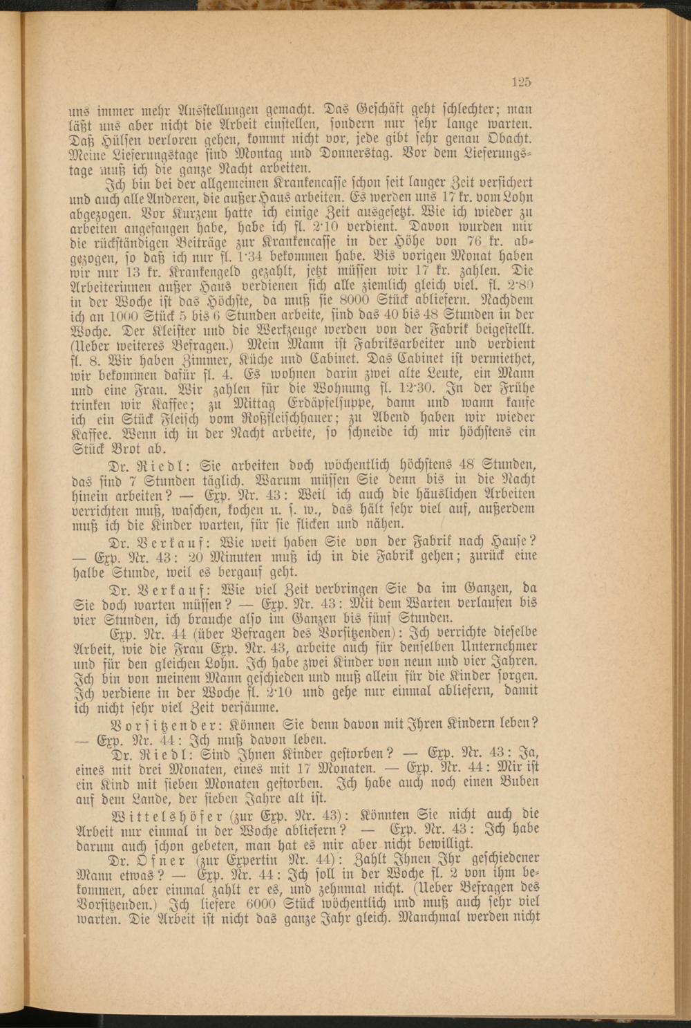 Dr. Riedl: Sie arbeiten doch wöchentlich höchstens 48 Stunden, das sind 7 Stunden täglich. Warum müssen Sie denn bis in die Nacht hinein arbeiten? — Exp. Nr. 43: Weil ich auch die häuslichen Arbeiten verrichten muß, waschen, kochen u. s. w., das hält sehr viel auf, außerdem muß ich die Kinder warten, für sie flicken und nähen. /