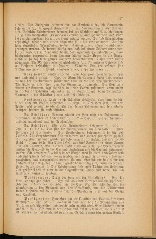 Dr. Schüller: Wie viele Arbeiterinnen bekommen fl. 1'20? Exp. I): 10 bis 15. Das sind die Anfängerinnen, die blos salzen. (Ueber Befragen des Vorsitzenden.) Die Sortirerinnen bekommen 2 kr. für das Tausend. Die Verpackerinnen sind im Accord und werden per Paket gezahlt. Die Bezahlung ist nicht gleich. Sie bekommen für 10 Pakete, das sind 10.000 Stück 3, 7 und 10 kr. Ein Paket besteht aus fünf Cartons; in einem Carton sind 200 Couverts, also in einem Paket 1000 Couverts. Die Verpackerinnen müssen die Couverts in die Cartons hineinlegen und die Cartons zusammen­packen. Sie verdienen fl. 5 bis 0 in der Woche, weil sie meist nach Feierabend noch eine Stunde dableiben sie werden nämlich nicht fertig um das aus­zuarbeiten, was vorgearbeitet worden ist, und lassen sich nur so viel für den nächsten Tag übrig, daß sie damit gerade dann fertig sind, wenn wieder neue Arbeit vorgearbeitet ist. Die Arbeiterinnen sind meist Töchter von Arbeitern. Der größte Theil ist nicht in der Organisation. Einige sind dabei, die sich fürchten entlassen zu werden.