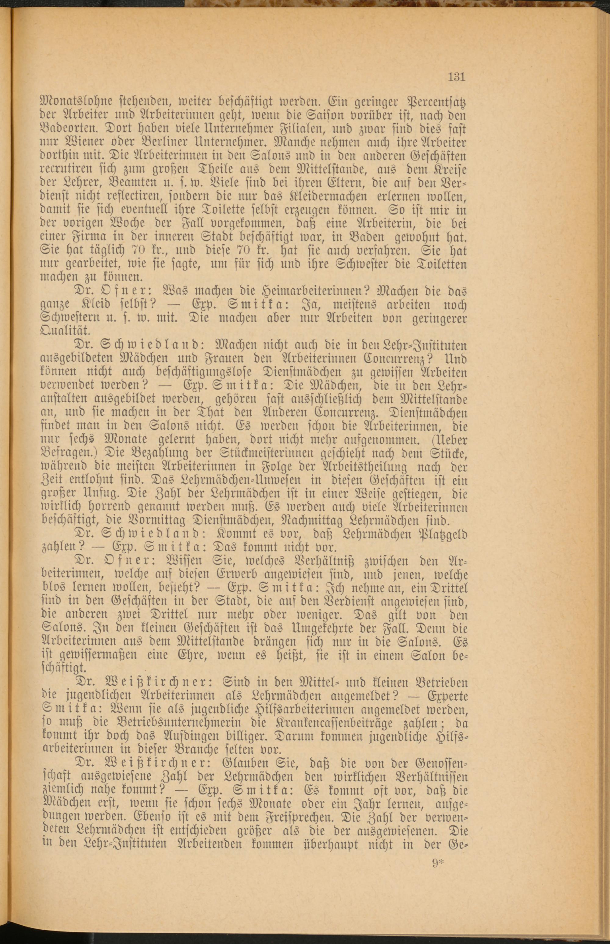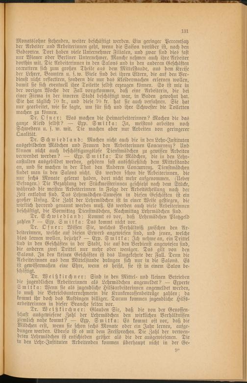 Dr. Weißkirchner: Sind in den Mittel- und kleinen Betrieben die jugendlichen Arbeiterinnen als Lehrmädchen angemeldet? Experte Smitka: Wenn sie als jugendliche Hilfsarbeiterinnen angemeldet werden, so muß die Betriebsunternehmerin die Krankencassenbeiträge zahlen; da kommt ihr doch das Aufdingen billiger. Darum kommen jugendliche Hilss- arbeiterinnen in dieser Branche selten vor.