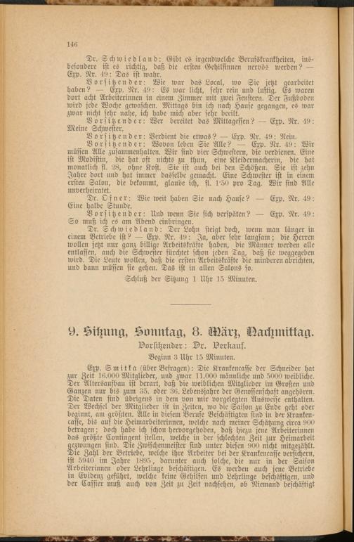 Vorsitzender: Wie war das Local, wo Sie jetzt gearbeitet haben? Exp. Nr. 49: Es war licht, sehr rein und luftig. Es waren dort acht Arbeiterinnen in einem Zimmer mit zwei Fenstern. Der Fußboden wird jede Woche gewaschen. Mittags bin ich nach Hause gegangen, es war zwar nicht sehr nahe, ich habe mich aber sehr beeilt.
