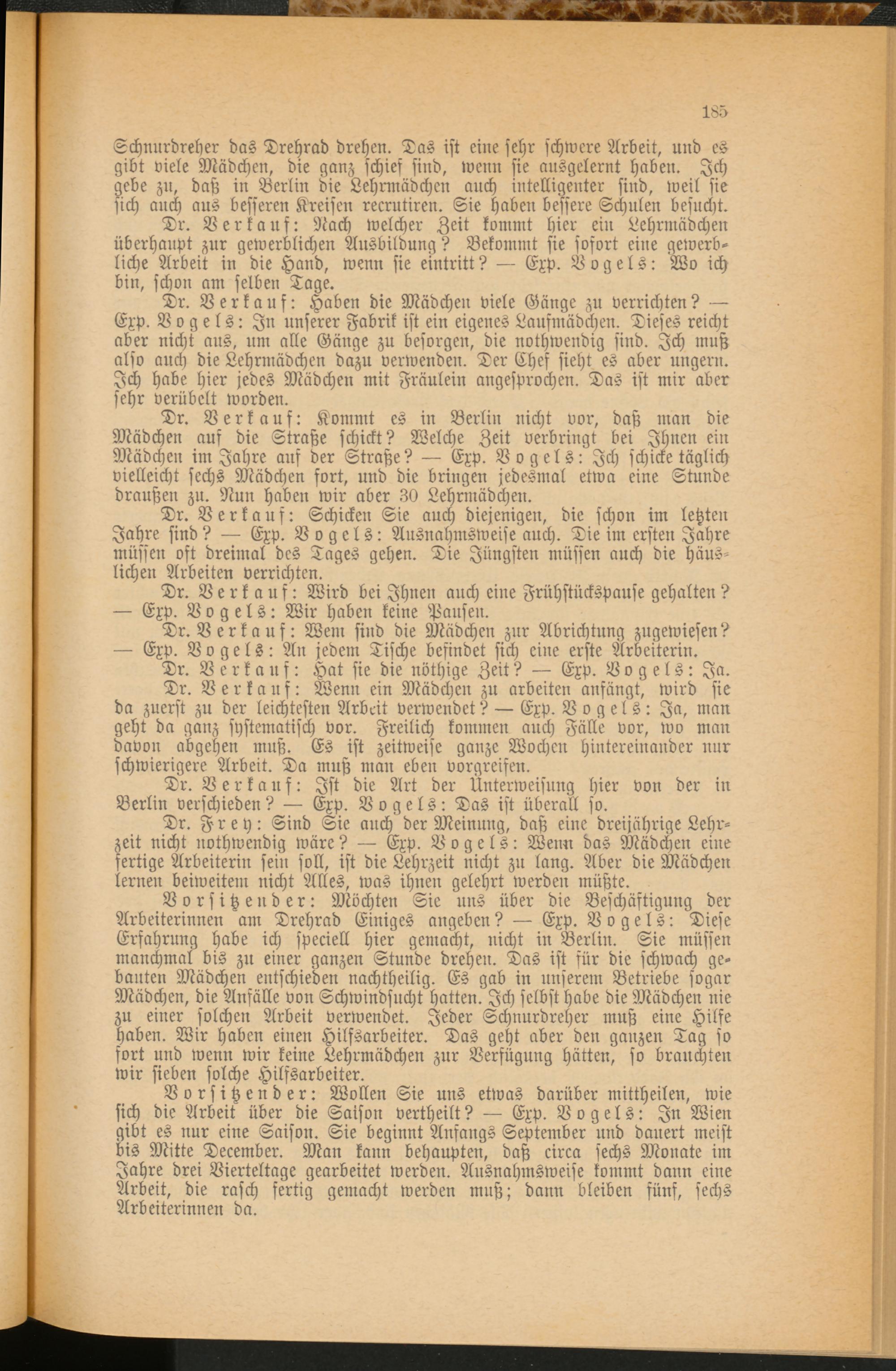 Dr. Verkauf: Kommt es in Berlin nicht vor, daß man die Mädchen auf die Straße schickt? Welche Zeit verbringt bei Ihnen ein Mädchen im Jahre aus der Straße? — Exp. Vogels: Ich schicke täglich vielleicht sechs Mädchen fort, und die bringen jedesmal etwa eine Stunde draußen zu. Nun haben wir aber 30 Lehrmädchen.