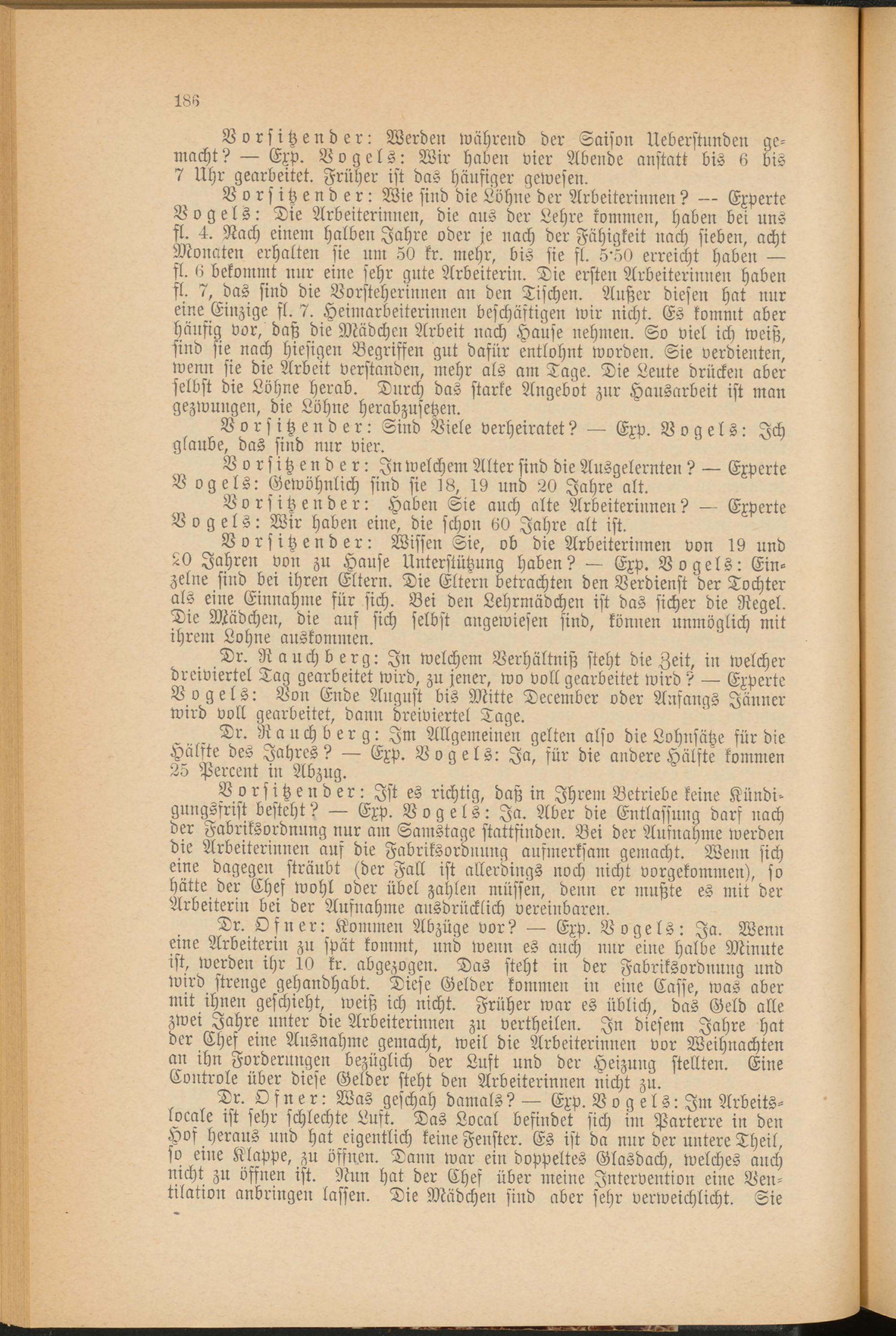 Vorsitzender: Wie sind die Lohne der Arbeiterinnen? — Experte Vogels: Die Arbeiterinnen, die aus der Lehre kommen, haben bei uns fl. 4. Nach einem halben Jahre oder je nach der Fähigkeit nach sieben, acht Monaten erhalten sie um 50 kr. mehr, bis sie fl. 5'50 erreicht haben — fl. 0 bekommt nur eine sehr gute Arbeiterin. Die ersten Arbeiterinnen haben fl. 7, das sind die Vorsteherinnen an den Tischen. Außer diesen hat nur eine Einzige fl. 7. Heimarbeiterinnen beschäftigen wir nicht. Es kommt aber häufig vor, daß die Mädchen Arbeit nach Hause nehmen. So viel ich weiß, sind sie nach hiesigen Begriffen gut dafür entlohnt worden. Sie verdienten, wenn sie die Arbeit verstanden, mehr als am Tage. Die Leute drücken aber selbst die Löhne herab. Durch das starke Angebot zur Hausarbeit ist man gezwungen, die Lohne herabzusetzen.