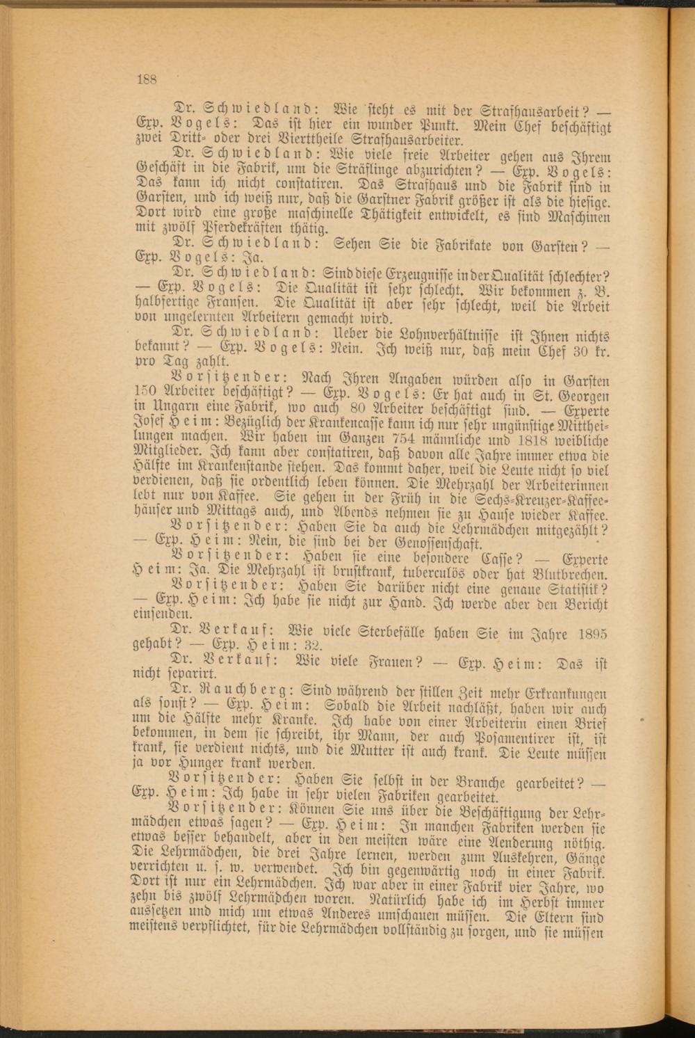 Dr. Schwiedland: Ueber die Lohnverhältnisse ist Ihnen nichts bekannt? — Exp. Vogels: Nein. Ich weiß nur, daß mein Chef 30 kr. vro Tag zahlt.