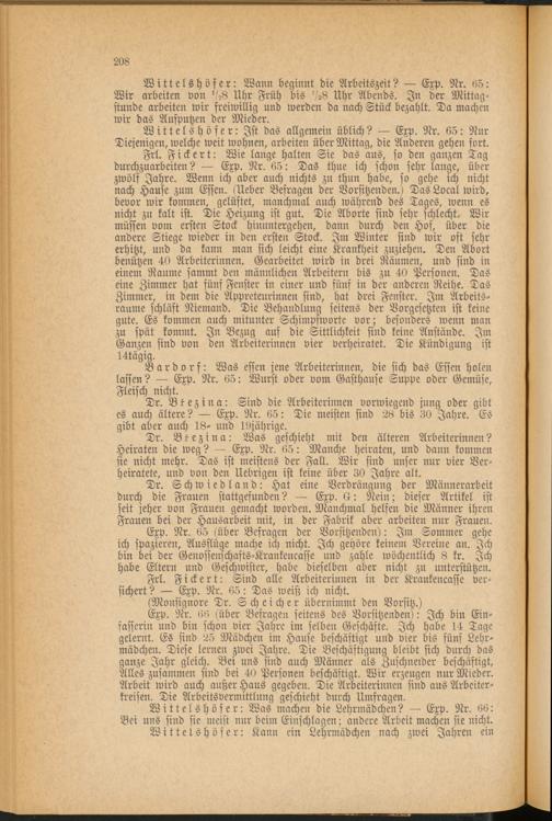 Wittelshöfer: Wann beginnt die Arbeitszeit? — Exp. Nr. 65: Wir arbeiten von V 28 Uhr Früh bis V 28 Uhr Abends. In der Mittagstunde arbeiten wir freiwillig und werden da nach Stück bezahlt. Da machen wir das Aufputzen der Mieder.