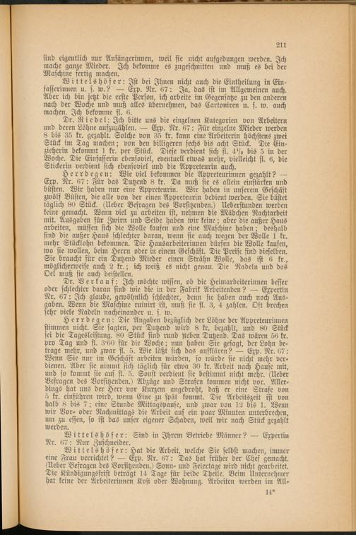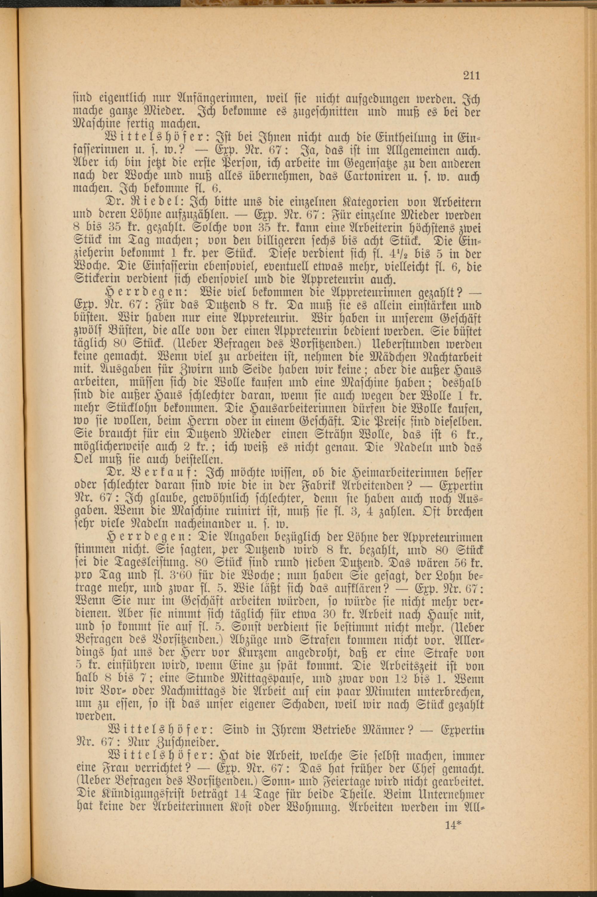 Dr. Riedel: Ich bitte uns die einzelnen Kategorien von Arbeitern und deren Löhne aufzuzählen. — Exp. Nr. 67: Für einzelne Mieder werden 8 bis 35 kr. gezahlt. Solche von 35 kr. kann eine Arbeiterin höchstens zwei Stück im Tag machen; von den billigeren sechs bis acht Stück. Die Ein- zieherin bekommt 1 kr. per Stück. Diese verdient sich fl. -IV 2 bis 5 in der Woche. Die Einfasserin ebensoviel, eventuell etwas mehr, vielleicht fl. 6, die Stickerin verdient sich ebensoviel und die Appreteurin auch.