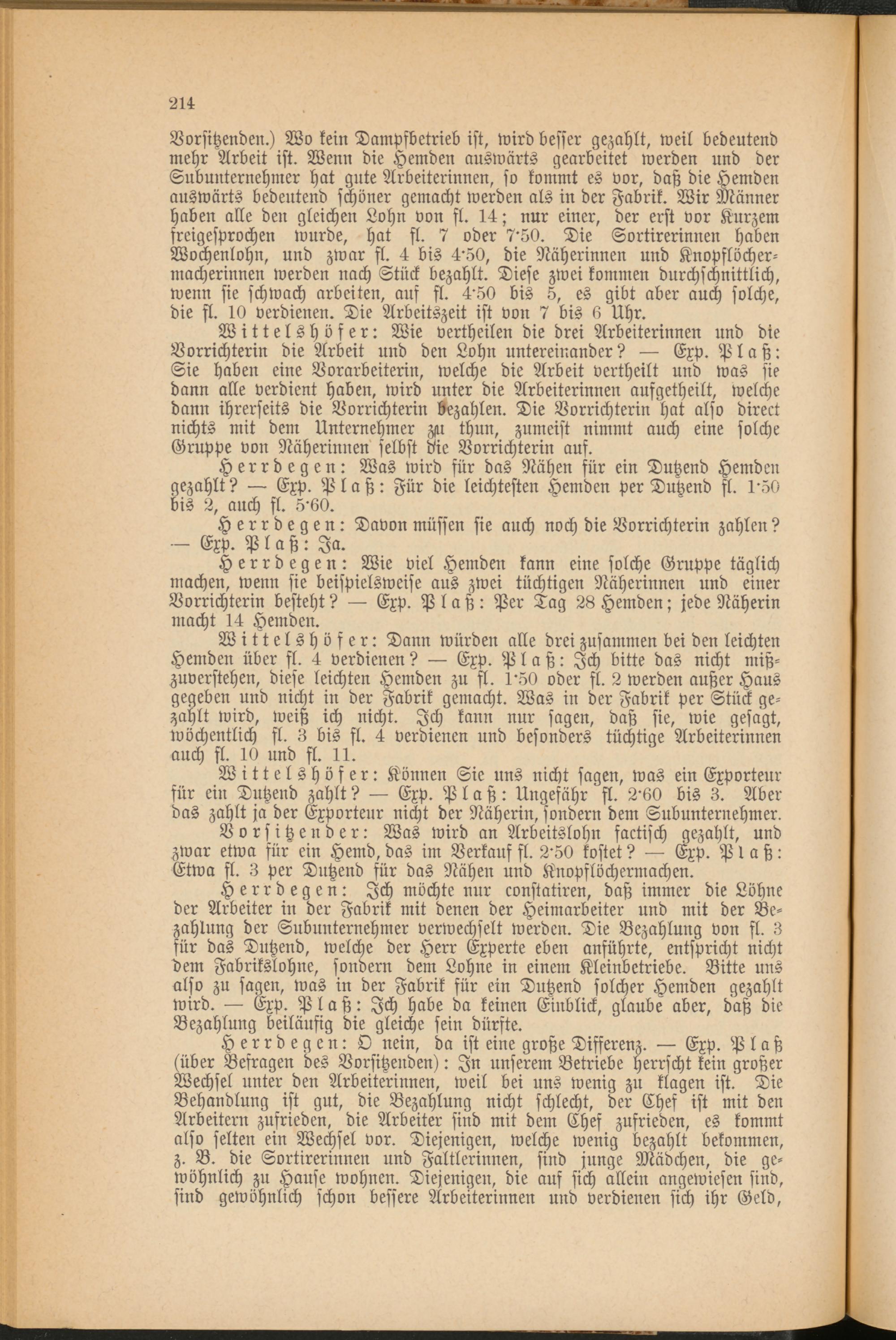 Vorsitzenden.) Wo kein Dampfbetrieb ist, wird besser gezahlt, weil bedeutend mehr Arbeit ist. Wenn die Hemden auswärts gearbeitet werden und der Subunternehmer hat gute Arbeiterinnen, so kommt es vor, daß die Hemden auswärts bedeutend schöner gemacht werden als in der Fabrik. Wir Männer haben alle den gleichen Lohn von fl. 14; nur einer, der erst vor Kurzem freigesprochen wurde, hat fl. 7 oder 7'50. Die Sortirerinnen haben Wochenlohn, und zwar fl. 4 bis 4'50, die Näherinnen und Knopflöchermacherinnen werden nach Stück bezahlt. Diese zwei kommen durchschnittlich, wenn sie schwach arbeiten, auf fl. 4'50 bis 5, es gibt aber auch solche, die fl. 10 verdienen. Die Arbeitszeit ist von 7 bis 6 Uhr.