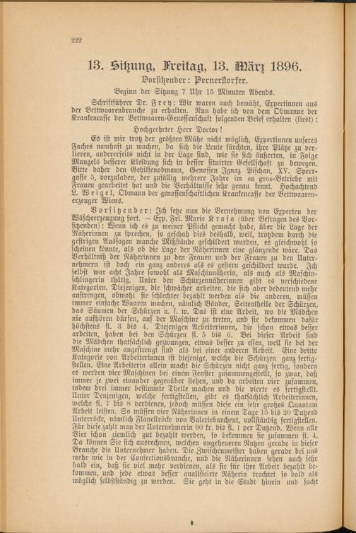 Schriftführer Dr. Frey: Wir waren auch bemüht, Expertinnen aus der Bettwaarenbranche zu erhalten. Nun habe ich von dem Obmanne der Krankencasfe der Bettwaaren-Genossenschaft folgenden Brief erhalten (liest):