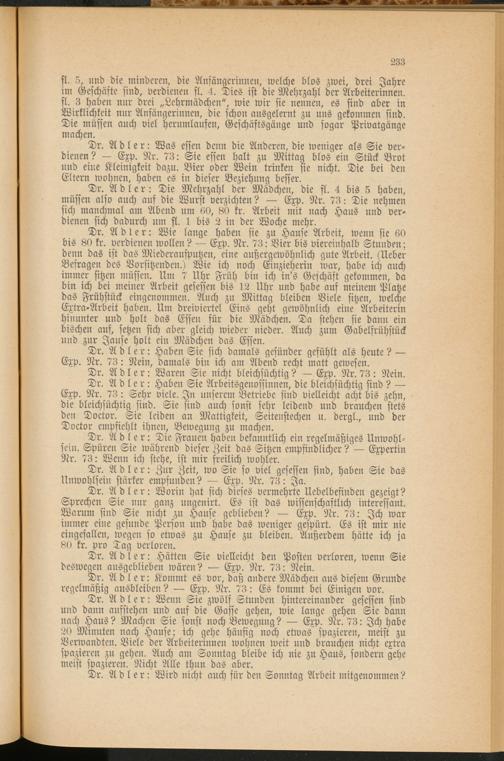 Dr. Adler: Haben Sie Arbeitsgenossinnen, die bleichsüchtig sind? — Exp. Nr. 73: Sehr viele. In unseren! Betriebe sind vielleicht acht bis zehn, die bleichsüchtig sind. Sie sind auch sonst sehr leidend und brauchen stets den Doctor. Sie leiden an Mattigkeit, Seitenstechen u. dergl., und der Doctor empfiehlt ihnen, Bewegung zu machen.