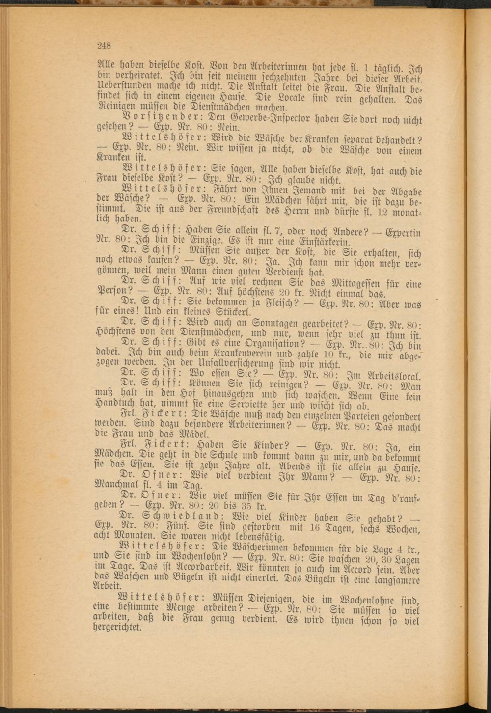 Dr. Schiff: Wird auch an Sonntagen gearbeitet? — Exp. Nr. 80: Höchstens von den Dienstmädchen, und nur, wenn sehr viel zu thun ist.