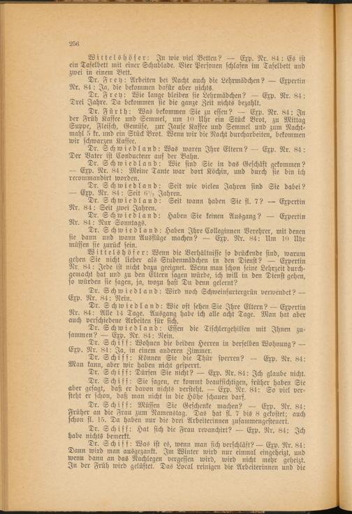 Dr. Schiff: Was ist es, wenn man sich verschläft? — Exp. Nr. 84: Dann wird man ausgezankt. Im Winter wird nur einmal eingeheizt, und wenn dann an das Nachlegen vergessen wird, wird nicht mehr geheizt. In der Früh wird gelüftet. Das Local reinigen die Arbeiterinnen und die