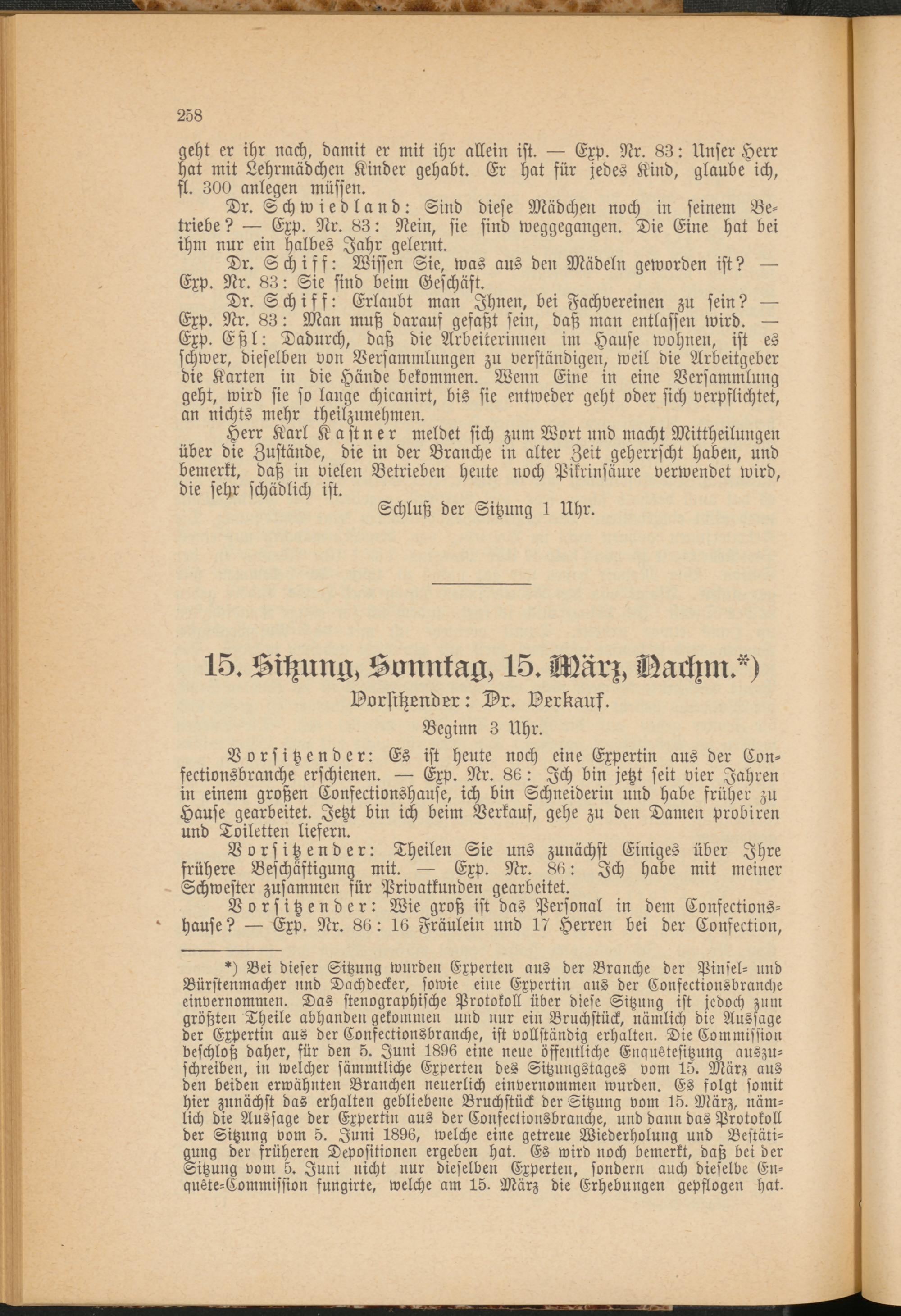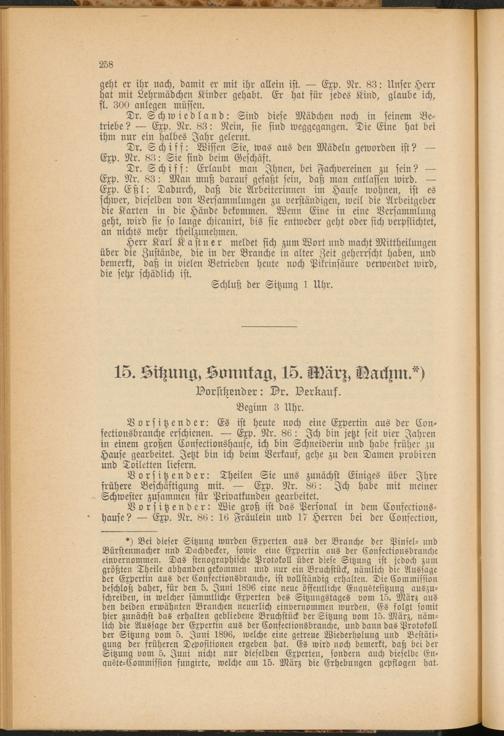 *) Bei dieser Sitzung wurden Experten aus der Branche der Pinsel- und Bürstenmacher und Dachdecker, sowie eine Expertin aus der Confectionsbranche einvernommen. Das stenographische Protokoll über diese Sitzung ist jedoch zum größten Theile abhanden gekommen und nur ein Bruchstück, nämlich die Aussage der Expertin aus der Confectionsbranche, ist vollständig erhalten. Die Commission beschloß daher, für den 5. Juni 1896 eine neue öffentliche EnquStesitzung auszu­schreiben, in welcher sämmtliche Experten des Sitzungstages vom 15. März aus den beiden erwähnten Branchen neuerlich einvernommen wurden. Es folgt somit hier zunächst das erhalten gebliebene Bruchstück der Sitzung vom 15. März, näm­lich die Aussage der Expertin aus der Confectionsbranche, und dann das Protokoll der Sitzung vom 5. Juni 1896, welche eine getreue Wiederholung und Bestäti­gung der früheren Depositionen ergeben hat. Es wird noch bemerkt, daß bei der Sitzung vom 5. Juni nicht nur dieselben Experten, sondern auch dieselbe En- qnöte-Commission fungirte, welche am 15. März die Erhebungen gepflogen hat.
