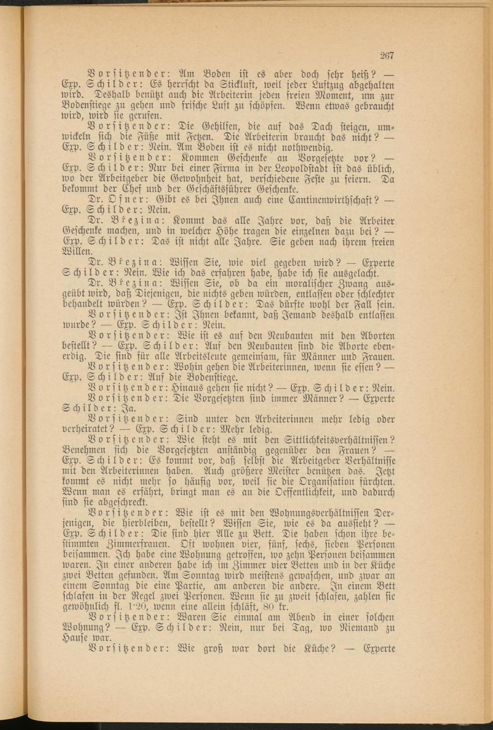 Vorsitzender: Wie ist es mit den Wohnungsverhältnissen Der­jenigen, die Hierbleiben, bestellt? Wissen Sie, wie es da aussieht? Exp. Schilder: Die sind hier Alle zu Bett. Die haben schon ihre be­stimmten Zimmerfrauen. Oft wohnen vier, fünf, sechs, sieben Personen beisammen. Ich habe eine Wohnung getroffen, wo zehn Personen beisammen waren. In einer anderen habe ich im Zimmer vier Betten und in der Küche zwei Betten gefunden. Am Sonntag wird meistens gewaschen, und zwar an einem Sonntag die eine Partie, am anderen die andere. In einem Bett schlafen in der Regel zwei Personen. Wenn sie zu zweit schlafen, zahlen sie gewöhnlich fl. 1'20, wenn eine allein schläft, 80 kr.