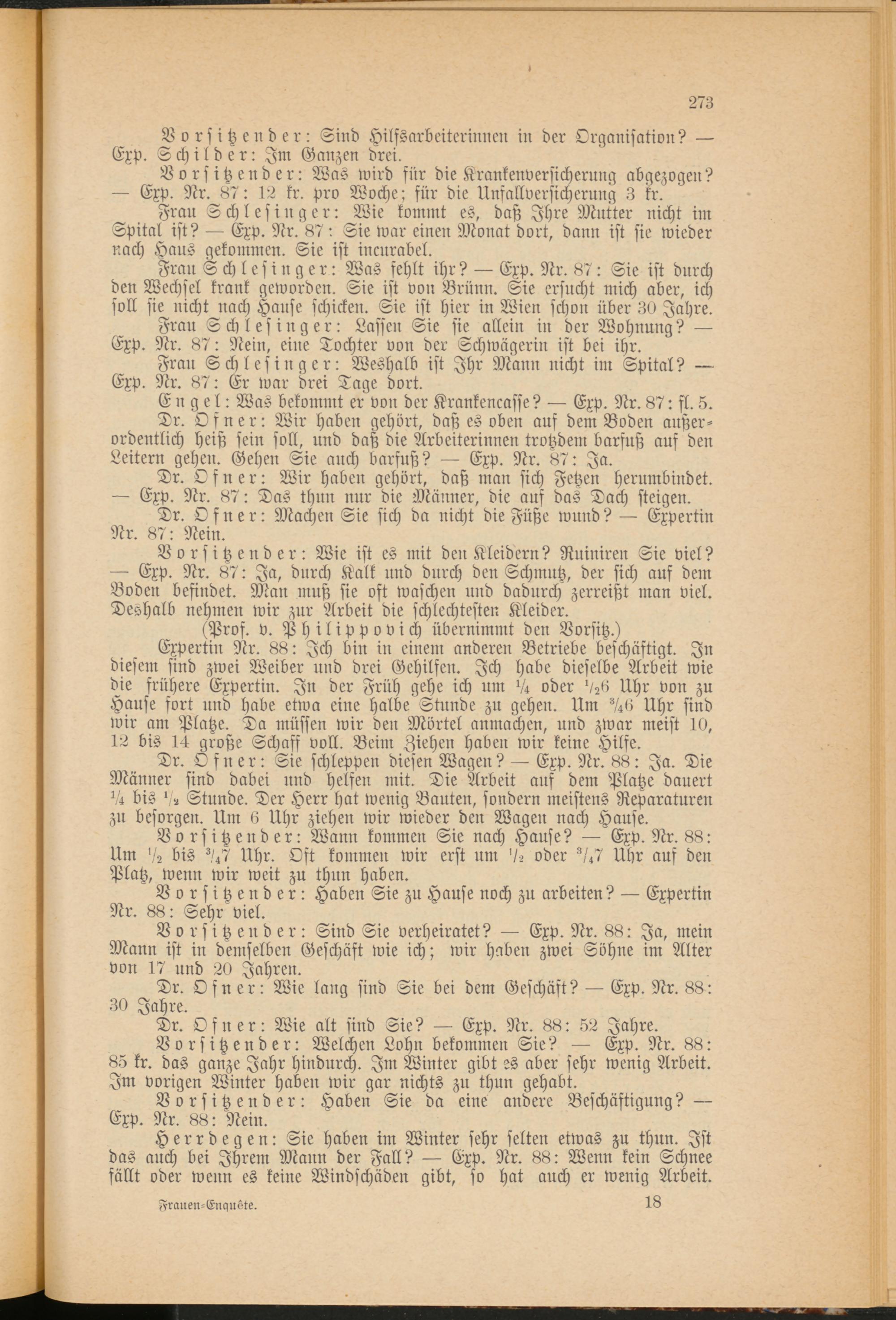 Engel: Was bekommt er von der Krankenkasse? — Exp. Nr. 87: sl. 5. Dr. Ofner: Wir haben gehört, daß es oben auf dem Boden außerordentlich heiß sein soll, und daß die Arbeiterinnen trotzdem barfuß auf den Leitern gehen. Gehen Sie auch barfuß? — Exp. Nr. 87: Ja.