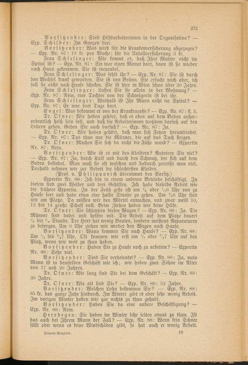 Dr. Ofner: Wie alt sind Sie? — Exp. Nr. 88: 52 Jahre. Vorsitzender: Welchen Lohn bekommen Sie? — Exp. Nr. 88: 85 kr. das ganze Jahr hindurch. Im Winter gibt es aber sehr wenig Arbeit. Im vorigen Winter haben wir gar nichts zu thun gehabt.