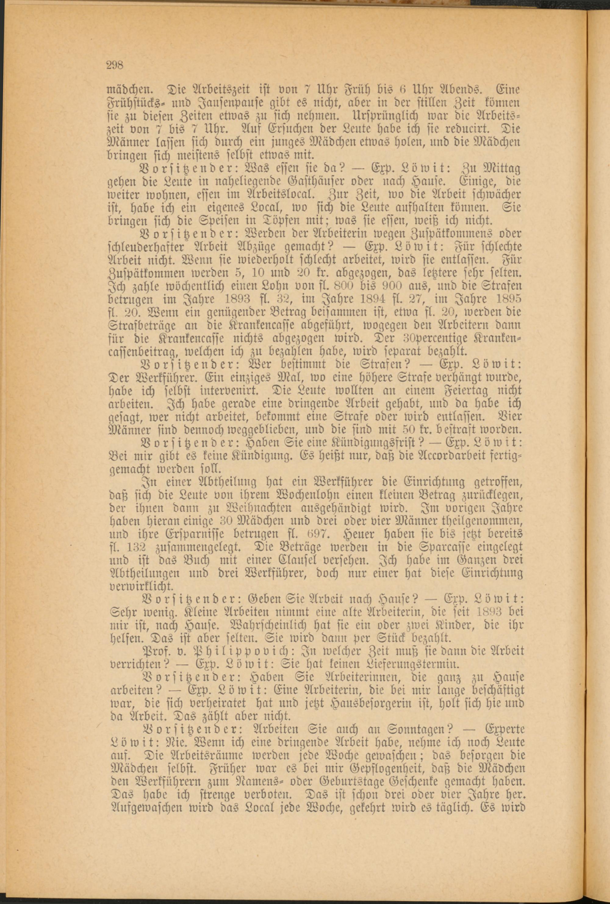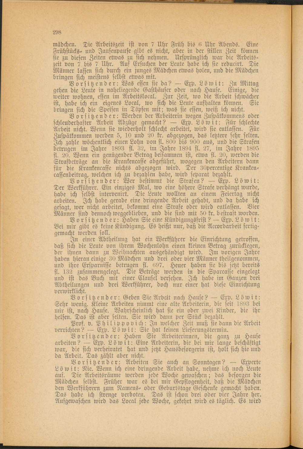 Vorsitzender: Was essen sie da? — Exp. Löwit: Zu Mittag gehen die Leute in naheliegende Gasthäuser oder nach Hause. Einige, die weiter wohnen, essen im Arbeitslocal. Zur Zeit, wo die Arbeit schwächer ist, habe ich ein eigenes Local, wo sich die Leute aufhalten können. Sie bringen sich die Speisen in Töpfen mit; was sie essen, weiß ich nicht.