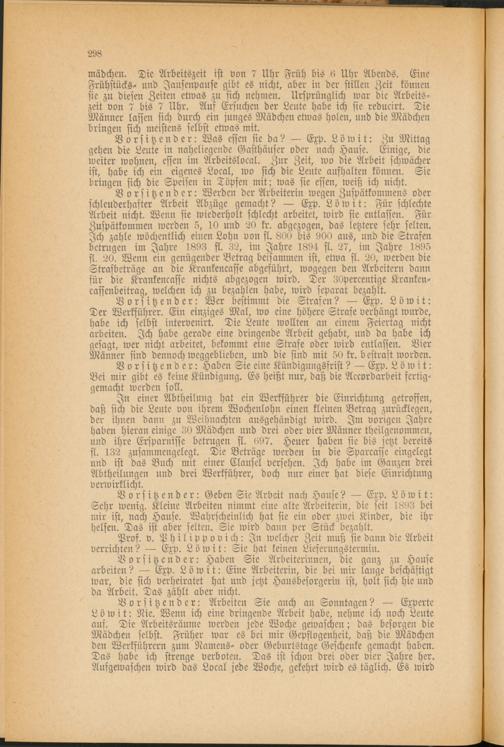 Vorsitzender: Geben Sie Arbeit nach Hause? — Exp. Löwit: Sehr wenig. Kleine Arbeiten nimmt eine alte Arbeiterin, die seit 1893 bei nur ist, nach Hause. Wahrscheinlich hat sie ein oder zwei Kinder, die ihr helfen. Das ist aber selten. Sie wird dann per Stück bezahlt.