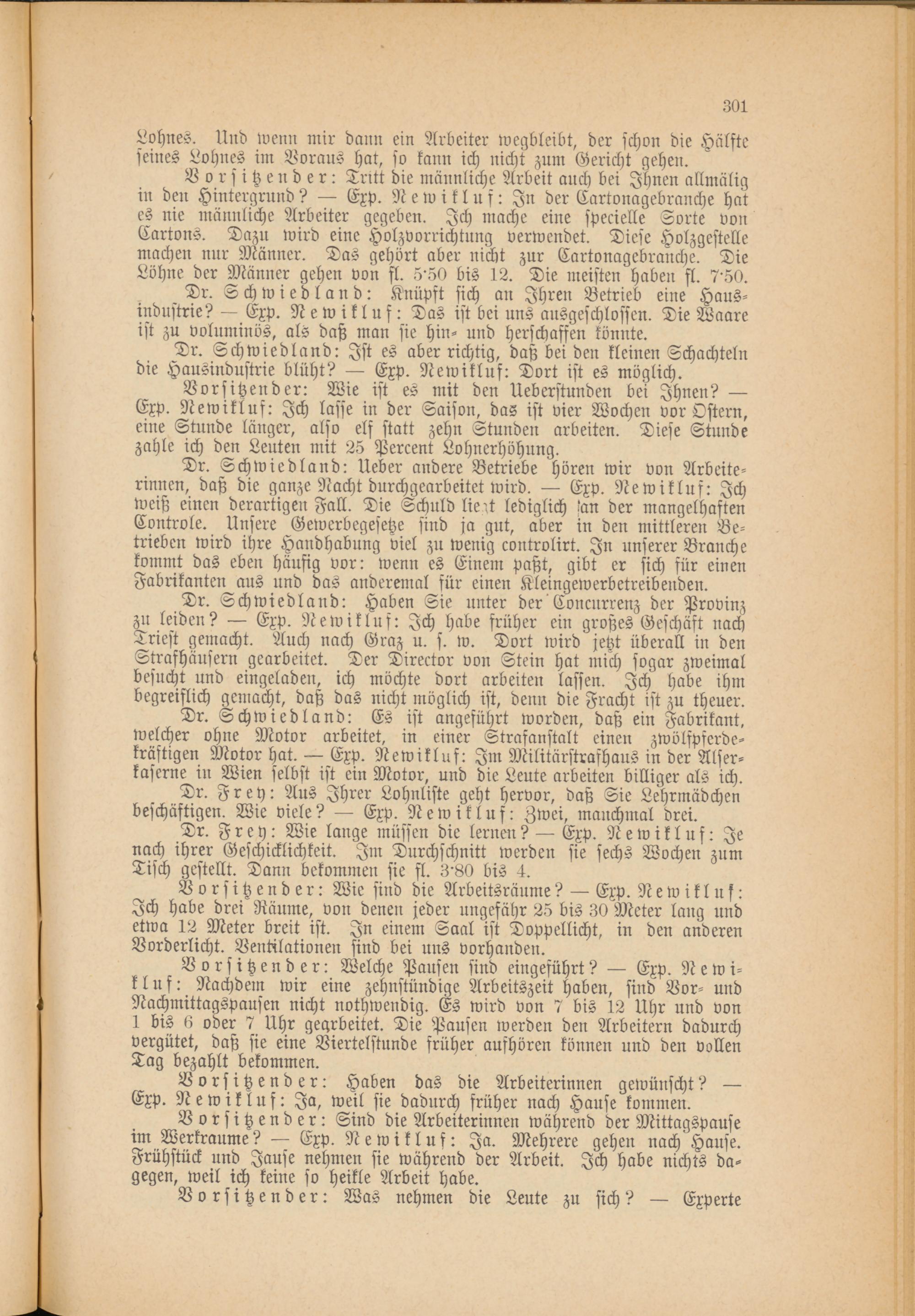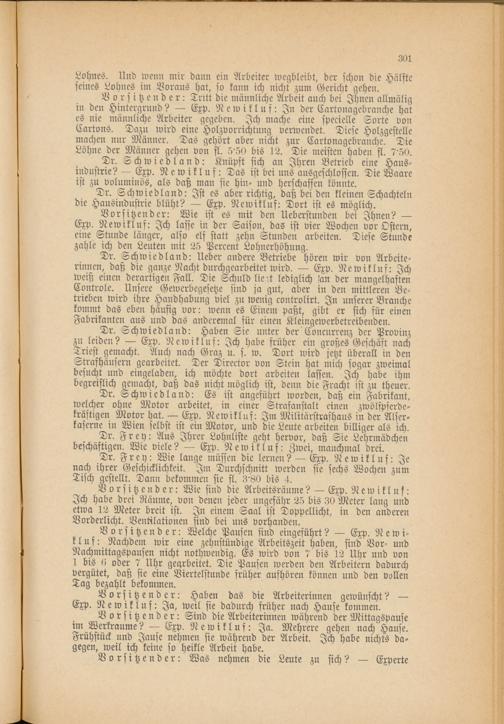 Vorsitzender: Sind die Arbeiterinnen während der Mittagspause im Werkraume? Exp. Newikluf: Ja. Mehrere gehen nach Hause. Frühstück und Jause nehmen sie während der Arbeit. Ich habe nichts da­gegen, weil ich keine so heikle Arbeit habe.