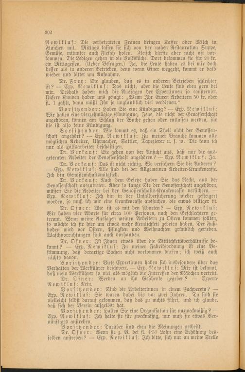 Vorsitzender: Viele Expertinnen haben sich insbesondere über das Verhalten der°Werkführer beschwert. — Exp. Newikluf: Mir ist bekannt, daß mein Werksührer so viel als möglich die Interessen der Mädchen vertritt.