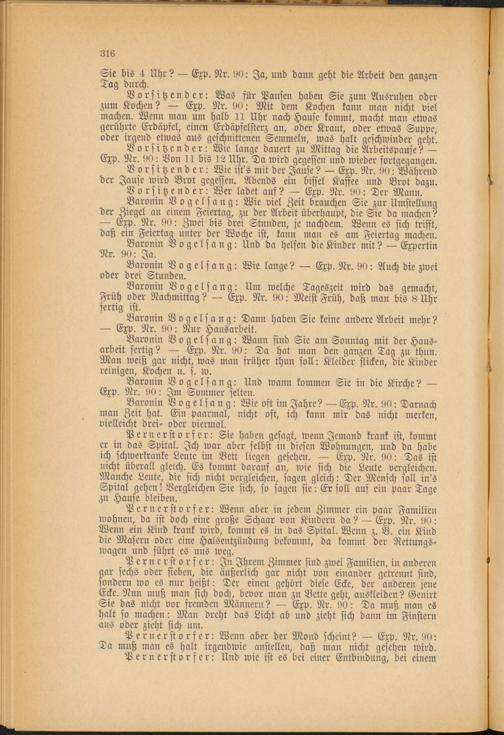 Pernerstorfer: Wenn aber in jedem Zimmer ein paar Familien wohnen, da ist doch eine große Schaar von Kindern da? — Exp. Nr. 90: Wenn ein Kind krank wird, kommt es in das Spital. Wenn z. B. ein Kind die Masern oder eine Halsentzündung bekommt, da kommt der Rettungswagen und führt es uns weg.