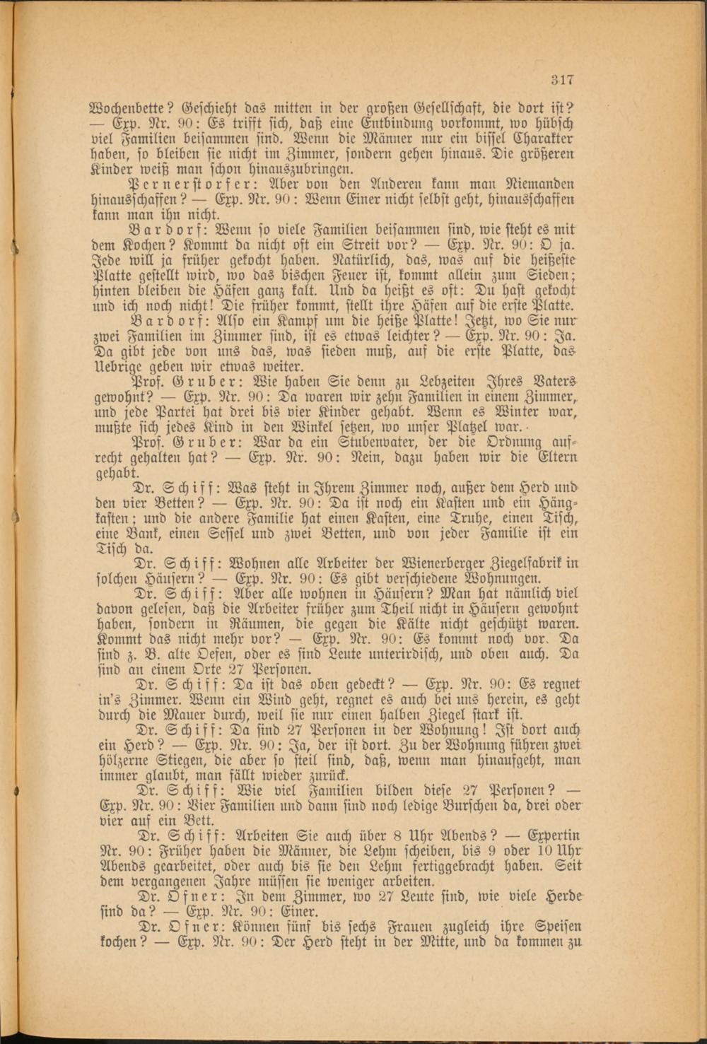 Dr. Schiff: Was steht in Ihrem Zimmer noch, außer dem Herd und den vier Betten? — Exp. Nr. 90: Da ist noch ein Kasten und ein Häng- kasten: und die andere Familie hat einen Kasten, eine Truhe, einen Tisch, eine Bank, einen Sessel und zwei Betten, und von jeder Familie ist ein Tisch da.
