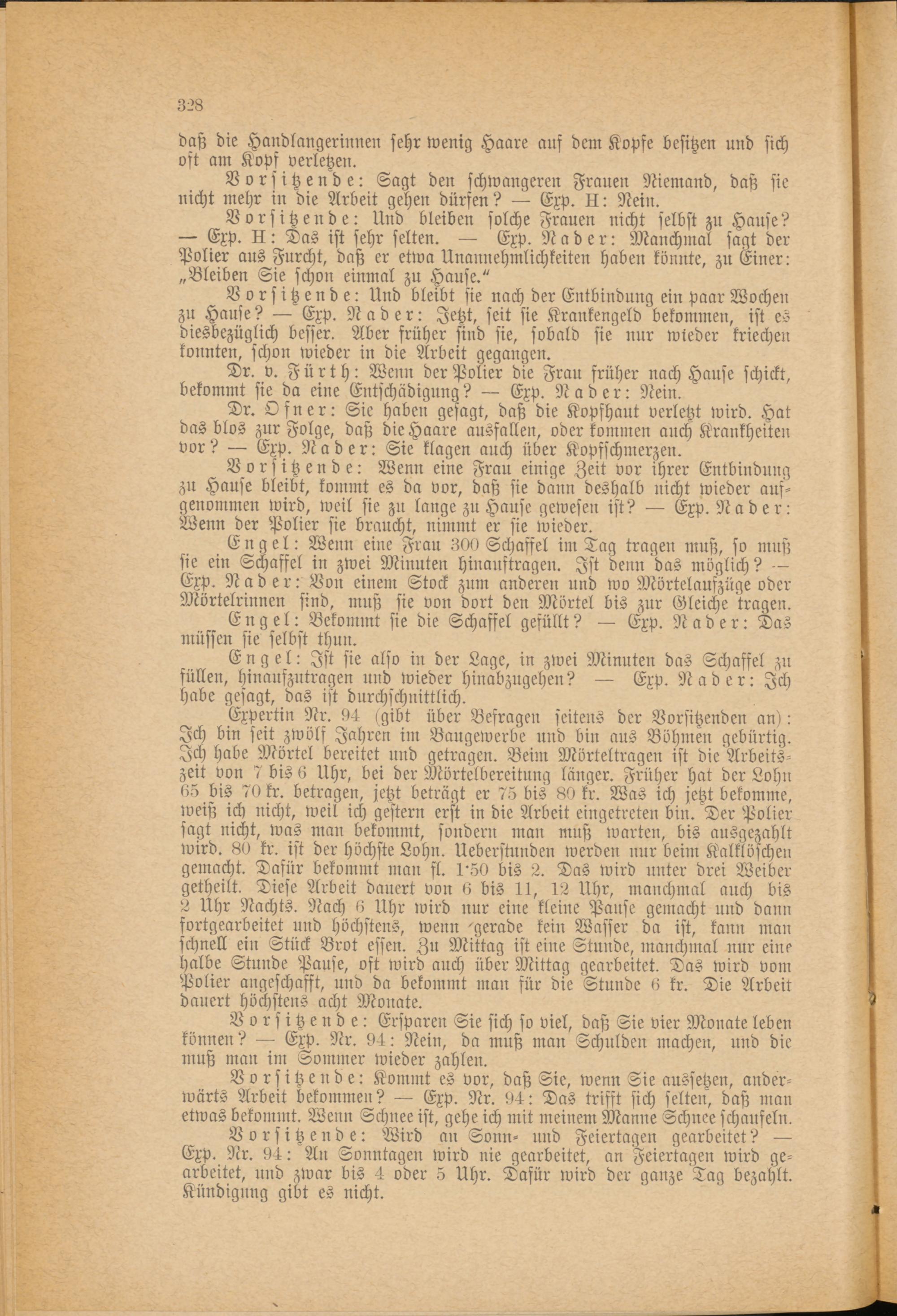 Expertin Nr. 04 (gibt über Befragen seitens der Vorsitzenden an): Ich bin seit zwölf Jahren im Baugewerbe und bin aus Böhmen gebürtig. Ich habe Mörtel bereitet und getragen. Bein: Mörteltragen ist die Arbeitszeit von 7 bis 6 Uhr, bei der Mörtelbereitnng länger. Früher hat der Lohn 05 bis 70 kr. betragen, jetzt beträgt er 7-5 bis 80 kr. Was ich jetzt bekomme, weiß ich nicht, weil ich gestern erst in die Arbeit eingetreten bin. "Der Polier sagt nicht, was man bekommt, sondern man muß warten, bis ausgezahlt wird. 80 kr. ist der höchste Lohn. Ueberstunden werden nur beim Kalklöschen gemacht. Dafür bekommt man fl. 1'50 bis 2. Das wird unter drei Weiber getheilt. Diese Arbeit dauert von 0 bis 11, 12 Uhr, manchmal auch bis 2 Uhr Nachts. Nach 0 Uhr wird nur eine kleine Pause gemacht und dann fortgearbeitet und höchstens, wenn -gerade kein Wasser da ist, kann man schnell ein Stück Brot essen. Zu Mittag ist eine Stunde, manchmal nur eine halbe Stunde Pause, oft wird auch über Mittag gearbeitet. Das wird vom Polier angeschafft, und da bekommt mau für die Stunde 0 kr. Die Arbeit dauert höchstens acht Monate.
