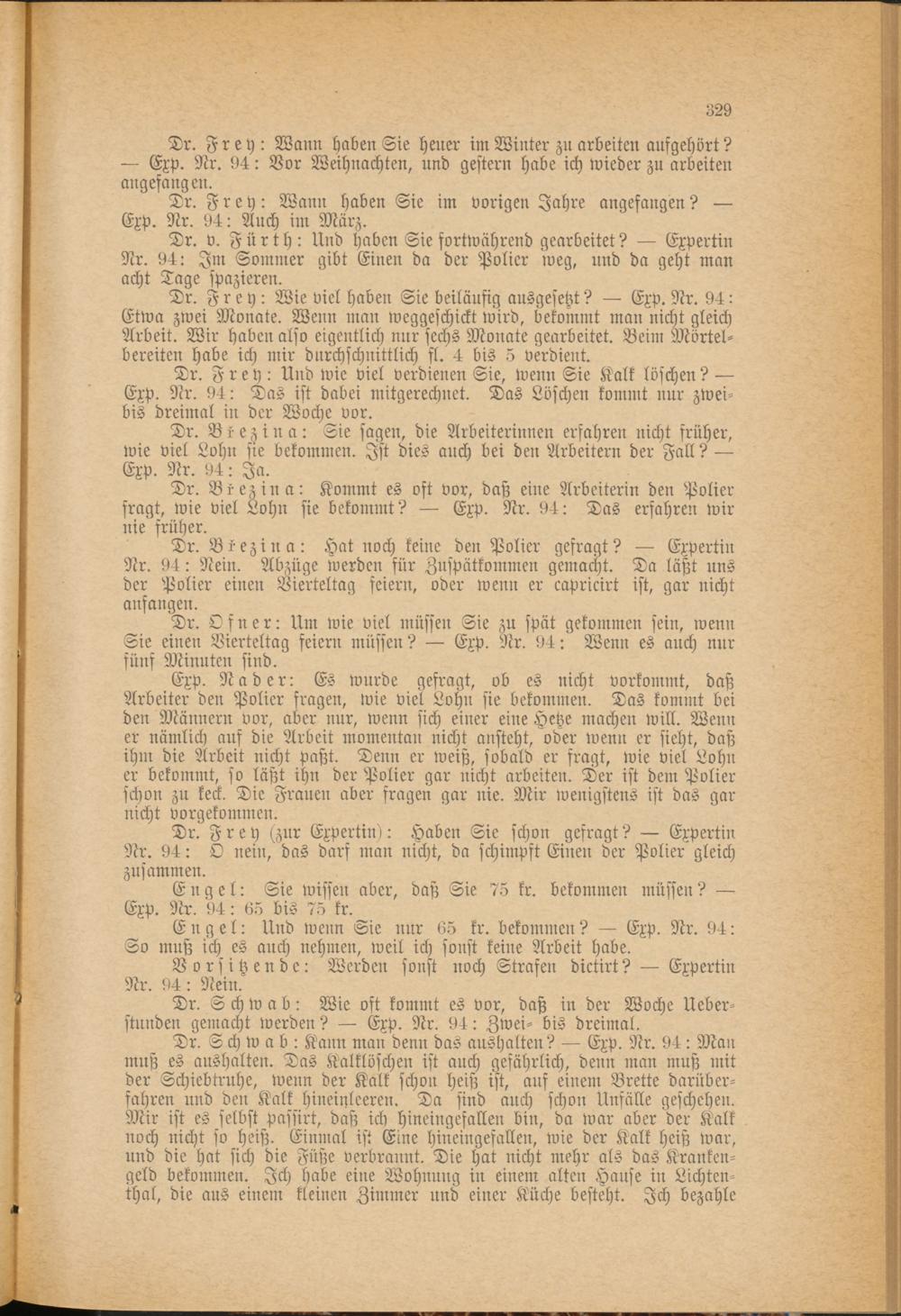 Dr. v. Fürth: Und haben Sie fortwährend gearbeitet? — Expertin Nr. 94: Im Sommer gibt Einen da der Polier weg, und da geht man acht Tage spazieren.