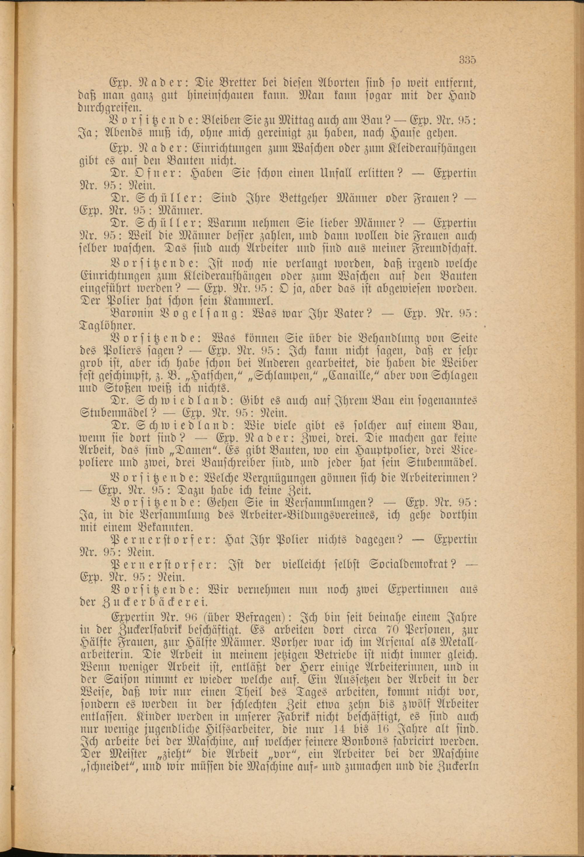 Dr. Schwiedland: Gibt es auch auf Ihrem Bau ein sogenanntes Stubenmädel? — Exp. Nr. 95: Nein.