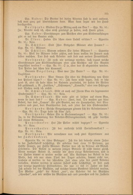 Expertin Nr. 96 (über Befragen): Ich bin seit beinahe einem Jahre in der Zuckerlfabrik beschäftigt. Es arbeiten dort circa 70 Personen, zur Hälfte Frauen, zur Hälfte Männer. Vorher war ich im Arsenal als Metallarbeitern:. Die Arbeit in meinem jetzigen Betriebe ist nicht immer gleich. Wenn weniger Arbeit ist, entläßt der Herr einige Arbeiterinnen, und in der Saison nimmt er wieder welche auf. Ein Aussetzen der Arbeit in der Weise, daß wir nur einen Theil des Tages arbeiten, kommt nicht vor, sondern es werden in der schlechten Zeit etwa zehn bis zwölf Arbeiter entlassen. Kinder werden in unserer Fabrik nicht beschäftigt, es sind auch nur wenige jugendliche Hilfsarbeiter, die nur 14 bis 16 Jahre alt sind. Ich arbeite bei der Maschine, auf welcher feinere Bonbons fabricirt werden. Der Meister „zieht" die Arbeit „vor", ein Arbeiter bei der Maschine „schneidet", und wir müssen die Maschine auf- und zumachen und die Zuckerln