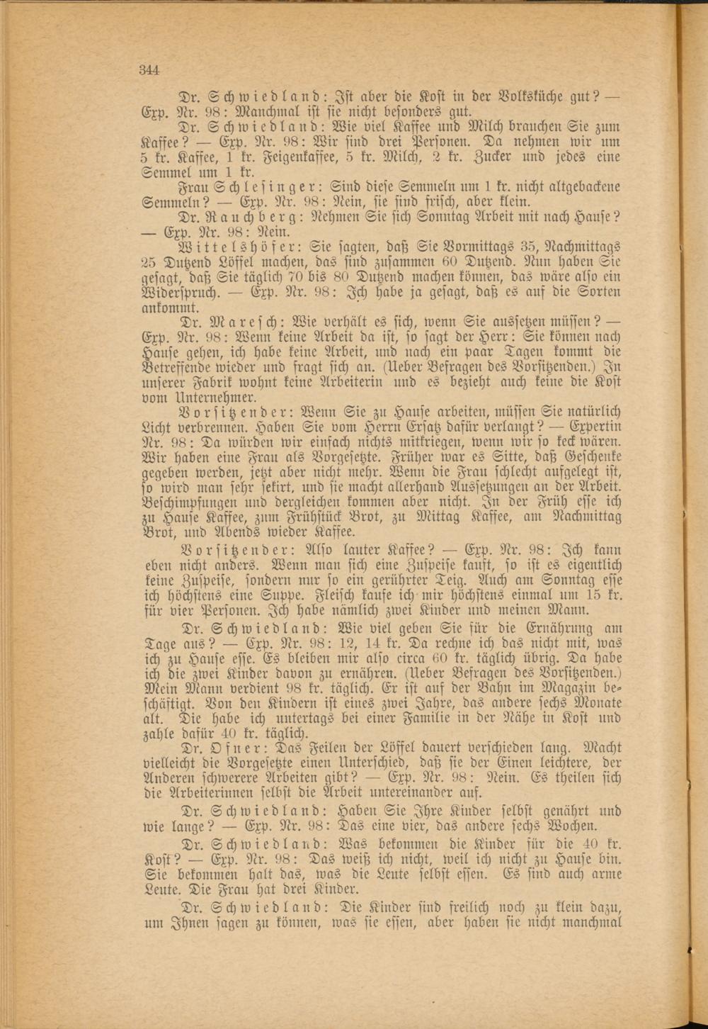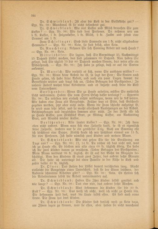 Dr. Schwiedland: Wie viel geben Sie für die Ernährung am Tage aus? Exp. Nr. 98: 12, 14 kr. Da rechne ich das nicht mit, was ich zu Hause esse. Es bleiben mir also circa 60 kr. täglich übrig. Da habe ich die zwei Kinder davon zu ernähren. (Ueber Befragen des Vorsitzenden.) Mein Mann verdient 98 kr. täglich. Er ist auf der Bahn im Magazin be­schäftigt. Von den Kindern ist eines zwei Jahre, das andere sechs Monate alt. Die habe ich untertags bei einer Familie in der Nähe in Kost und zahle dafür 40 kr. täglich.