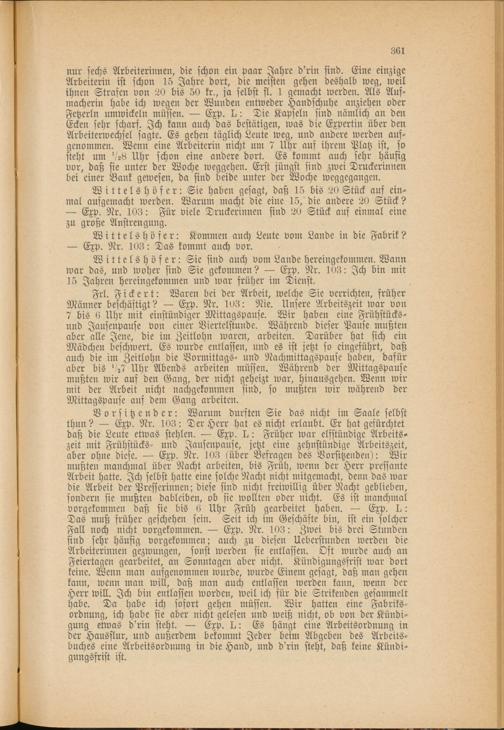 nur sechs Arbeiterinnen, die schon ein paar Jahre d'rin sind. Eine einzige Arbeiterin ist schon 15 Jahre dort, die meisten gehen deshalb weg, weil ihnen Strafen von 20 bis 50 kr., ja selbst fl. 1 gemacht werden. Als Auf- macherin habe ich wegen der Wunden entweder Handschuhe anziehen oder Fetzerln umwickeln müssen. — Exp. L: Die Kapseln sind nämlich an den Ecken sehr scharf. Ich kann auch das bestätigen, was die Expertin über den Arbeiterwechsel sagte. Es gehen täglich Leute weg, und andere werden aufgenommen. Wenn eine Arbeiterin nicht um 7 Uhr auf ihrem Platz ist, so steht um Uhr schon eine andere dort. Es kommt auch sehr häufig vor, daß sie unter der Woche weggehen. Erst jüngst sind zwei Druckerinnen bei einer Bank gewesen, da sind beide unter der Woche weggegangen.
