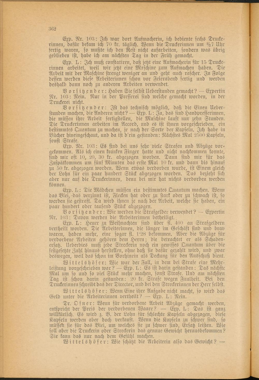 Exp. Nr. 103: Es sind bei uns sehr viele Strafen und Abzüge vor­gekommen. Als ich einen kränken Finger hatte und nicht nachkommen konnte, sind mir oft 10, 20, 30 kr. abgezogen worden. Dann sind mir für das Zuspätkommen um fünf Miuuteu das erste Mal 10 kr. uud dauu bis hinaus zu 50 kr. abgezogen worden. Wenn etwas verdorben wurde, ist Einem gleich der Lohn für ein paar hundert Stück abgezogen worden. Das bezieht sich aber nur auf die Druckerinnen, denn bei mir hat nichts verdorben werden können.