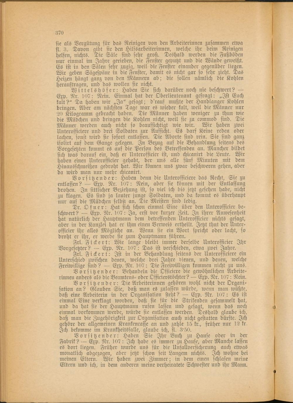 Vorsitzender: Die Arbeiterinnen gehören wohl nicht der Organisation an? Glauben Sie, daß man es zulassen würde, wenn man wüßte, daß eine Arbeiterin in der Organisation steht? — Exp. Nr. 107: Es ist einmal Eine verklagt worden, daß sie für die Sinkenden gesammelt hat, und da hat sie der Hauptmann rufen lassen und gesagt, wenn das noch einmal vorkommen werde, würde sie entlassen werden. Deshalb glaube ich, daß man die Zugehörigkeit zur Organisation auch nicht gestatten dürfte. Ich gehöre der allgemeinen Krankencasse an und zahle 15 kr., früher nur 12 kr. Ich bekomme im Krankheitsfalls, glaube ich, fl. 3'50.