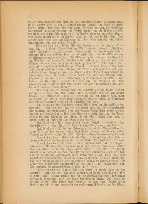 Vorsitzender: Haben Sie Ihr Buch zu Hause oder in der Fabrik? — Exp. Nr. 107: Ich habe es immer zu Hause, aber Manche lassen es dort liegen. Früher wurde uns für die Unfallversicherung auch etwas monatlich abgezogen, aber jetzt schon seit Langem nichts. Ich wohne bei meinen Eltern. Wir haben zwei Zimmer; in dem einen schlafen meine Eltern und ich, in dem anderen meine verheiratete Schwester und ihr Mann.