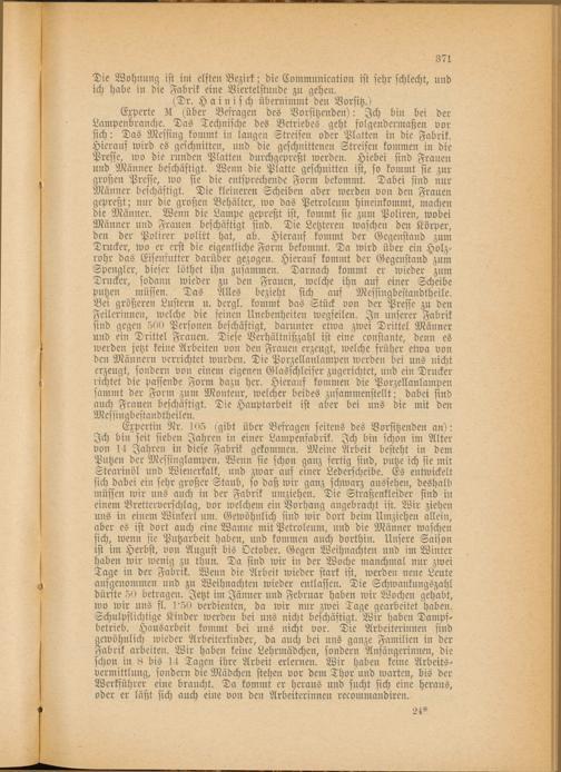 Expertin Nr. 105 (gibt über Befragen seitens des Vorsitzenden an): Ich bin seit sieben Jahren in einer Lampenfabrik. Ich bin schon im Alter von 14 Jahren in diese Fabrik gekommen. Meine Arbeit besteht in dem Putzen der Messinglampen. Wenn sie schon ganz fertig sind, putze ich sie mir Stearinöl und Wienerkalk, und zwar auf einer Lederscheibe. Es entwickelt sich dabei ein sehr großer Staub, so daß wir ganz schwarz aussehen, deshalb müssen wir uns auch in der Fabrik umziehen. Die Straßenkleider sind in einem Bretterverschlag, vor welchem ein Vorhang angebracht ist. Wir ziehen uns in einem Winker! um. Gewöhnlich sind wir dort beim Umziehen allein, aber es ist dort auch eine Wanne mit Petroleum, und die Männer waschen sich, wenn sie Putzarbeit haben, und kommen auch dorthiu. Unsere Saison ist im Herbst, von August bis October. Gegen Weihnachten und im Winter haben wir wenig zu thun. Da sind wir in der Woche manchmal nur zwei Tage in der Fabrik. Wenn die Arbeit wieder stark ist, werden neue Leute aufgenommen und zu Weihnachten wieder entlassen. Die Schwanknngszahl dürfte 50 betragen. Jetzt im Jänner und Februar haben wir Wochen gehabt, wo wir uns fl. U50 verdienten, da wir nur zwei Tage gearbeitet haben. Schulpflichtige Kinder werden bei uns nicht beschäftigt. Wir haben Dampf­betrieb. Hausarbeit kommt bei uns nicht vor. Die Arbeiterinnen sind gewöhnlich wieder Arbeiterkinder, da auch bei uus ganze Familien in der Fabrik arbeiten. Wir haben keine Lehrmädchen, sondern Anfängerinnen, die schon in 8 bis 14 Tagen ihre Arbeit erlernen. Wir haben keine Arbeits­vermittlung, sondern die Mädchen stehen vor dem Thor und warten, bis der Werkführer eine braucht. Da kommt er heraus und sucht sich eine heraus, oder er läßt sich auch eine von den Arbeiterinnen recommandiren.