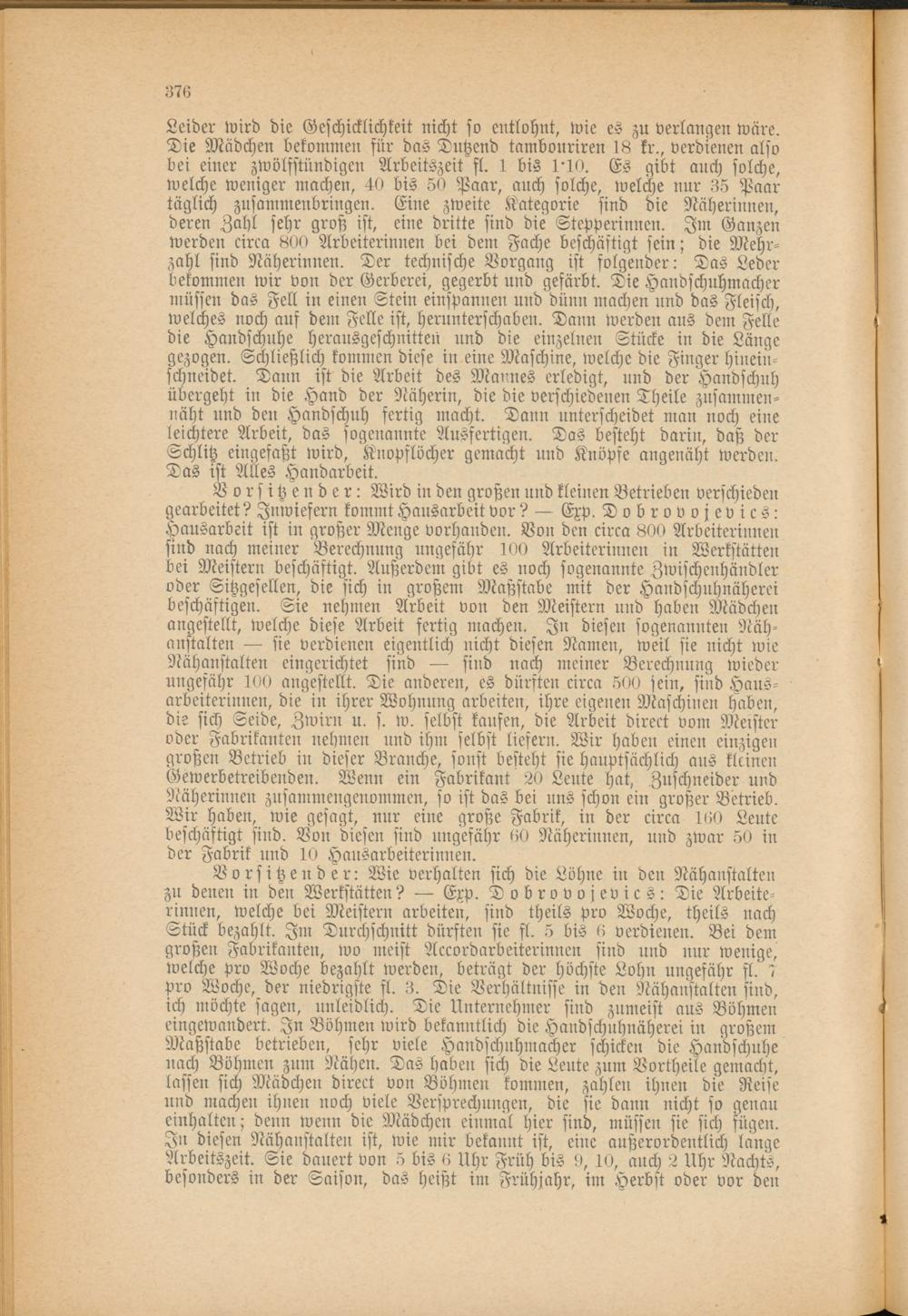 Vorsitzender: Wie verhalten sich die Löhne in den Nähanstalten zu denen in den Werkstätten? Exp. Dobrovojevics: Die Arbeite­rinnen, welche bei Meistern arbeiten, sind theils pro Woche, theils nach Stück bezahlt. Im Durchschnitt dürften sie fl. 5 bis 6 verdienen. Bei dem großen Fabrikanten, wo meist Accordarbeiterinnen sind und nur wenige, welche pro Woche bezahlt werden, beträgt der höchste Lohn ungefähr fl. 7 Pro Woche, der niedrigste fl. 8. Die Verhältnisse in den Nähanstalten sind, ich möchte sagen, unleidlich. Die Unternehmer sind zumeist aus Böhmen eingewandert. In Böhmen wird bekanntlich die Handschuhnäherei in großem Maßstabe betrieben, sehr viele Handschuhmacher schicken die Handschuhe nach Böhmen zum Nähen. Das haben sich die Leute zum Vortheile gemacht, lassen sich Mädchen direct von Böhmen kommen, zahlen ihnen die Reise und machen ihnen noch viele Versprechungen, die sie dann nicht so genau einhalten; denn wenn die Mädchen einmal hier sind, müssen sie sich fügen. In diesen Nähanstalten ist, wie mir bekannt ist, eine außerordentlich lange Arbeitszeit. Sie dauert von 5 bis 6 Uhr Früh bis 9, 10, auch 2 Uhr Nachts, besonders in der Saison, das heißt im Frühjahr, im Herbst oder vor den
