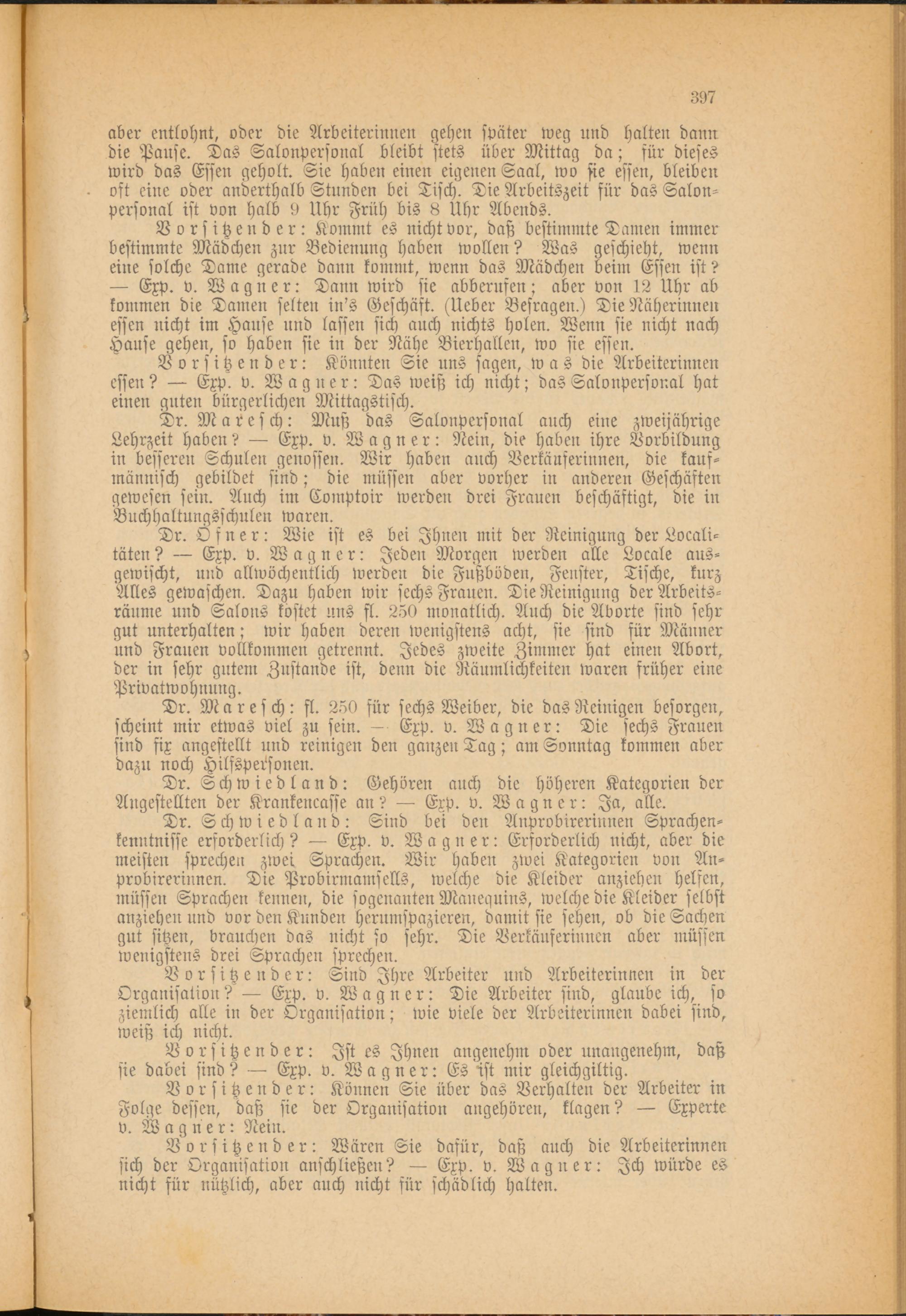 Vorsitzender: Könnten Sie uns sagen, was die Arbeiterinnen essen? Exp. v. Wagner: Das weiß ich nicht; das Salonpersonal hat einen guten bürgerlichen Mittagstisch.