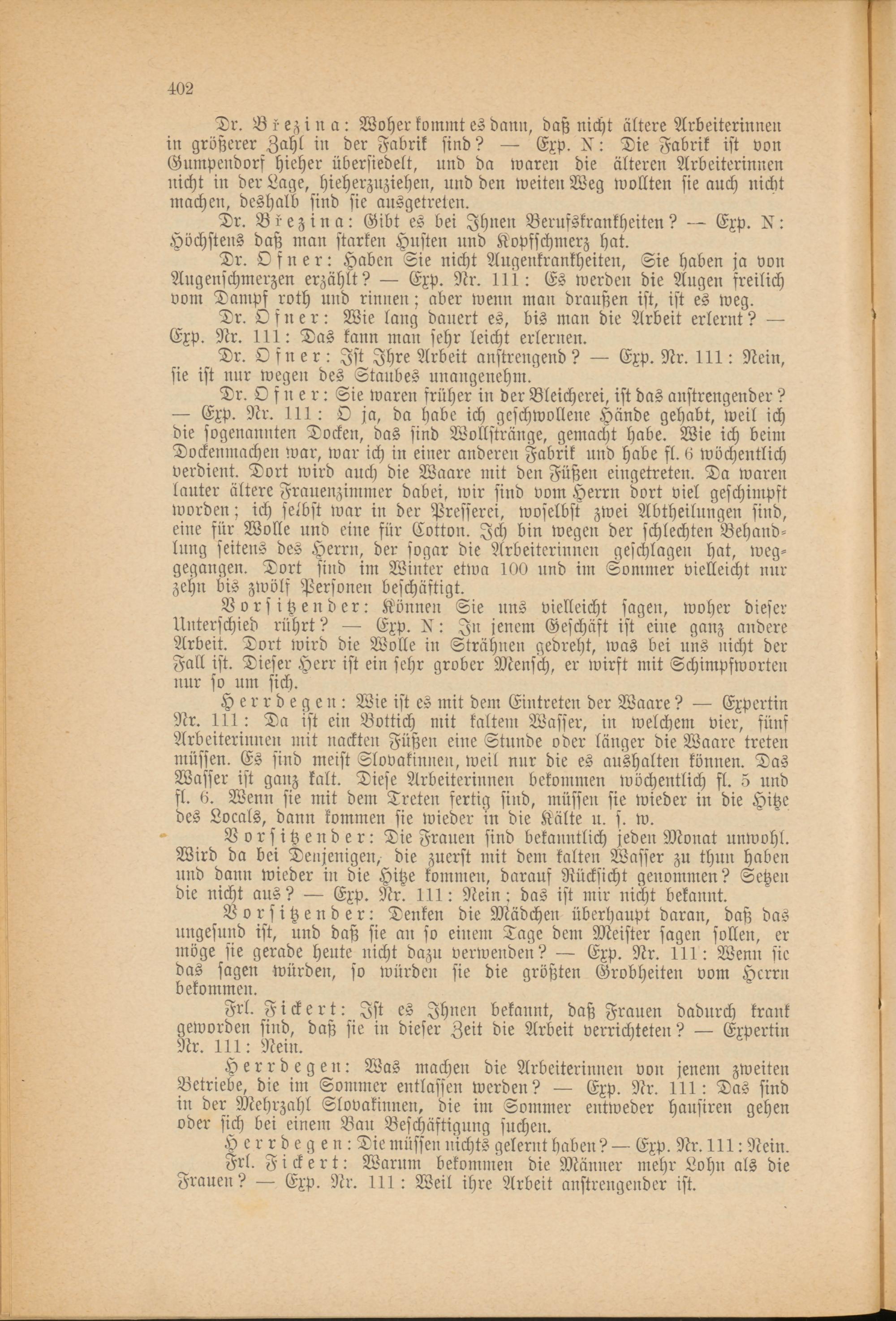 Dr. Ofner: Sie waren früher in der Bleicherei, ist das anstrengender ? — Exp. Nr. 111: O ja, da habe ich geschwollene Hände gehabt, weil ich die sogenannten Docken, das sind Wollstränge, gemacht habe. Wie ich beim Dockenmachen war, war ich in einer anderen Fabrik und habe fl. 6 wöchentlich verdient. Dort wird auch die Waare mit den Füßen eingetreten. Da waren lauter ältere Frauenzimmer dabei, wir sind vom Herrn dort viel geschimpft worden; ich selbst war in der Presserei, woselbst zwei Abtheilungen sind, eine für Wolle und eine für Cotton. Ich bin wegen der schlechten Behandlung seitens des Herrn, der sogar die Arbeiterinnen geschlagen hat, weggegangen. Tort sind im Winter etwa 100 und im Sommer vielleicht nur zehn bis zwölf Personen beschäftigt.