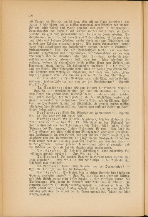 Dr. Rauchberg: Kann also zum Beispiel die Winderiu knüpfen? Exp. Nr. 113: Gewöhnlich nicht. Ich kann alle Arbeiten, weil ich sie vom Sehen aus gelernt habe. wiewohl ich darin nicht unterrichtet worden bin. (Ueber Befragen des Vorsitzenden.) An den Wirkstühlen werden auch Frauen verwendet. Die machen dann dieselbe Arbeit wie die Männer. Selbst dort, wo Handbetrieb ist, sind das Mühlstühle, die gedreht werden müssen. Wir haben keine Arbeitsvermittlung, sondern man muß von Fabrik zu Fabrik Arbeit suchen gehen.