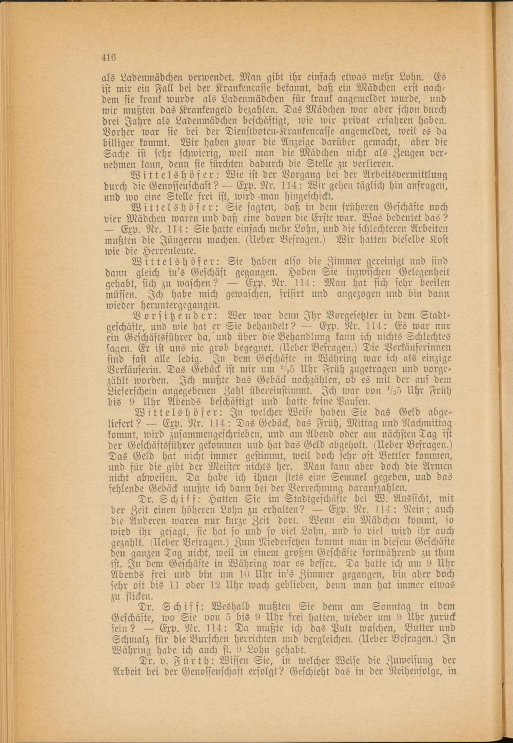 Dr. Schiff: Weshalb mußten Sie denn am Sonntag in dem Geschäfte, wo Sie von 5 bis 9 Uhr frei hatten, wieder um 9 Uhr zurück sein? — Exp. Nr. 114: Da mußte ich das Pult waschen, Butter und Schmalz für die Burschen Herrichten und dergleichen. (Ueber Befragen.) In Währing habe ich auch fl. 9 Lohn gehabt.
