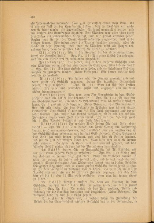 Wittelsh öfer: Sie haben also die Zimmer gereinigt und find dann gleich in's Geschäft gegangen. Haben Sie inzwischen Gelegenheit gehabt, sich zu waschen? — Exp. Nr. l14: Man hat sich sehr beeilen müssen. Ich habe mich gewaschen, frisirt und angezogen und bin dann wieder heruntergegangen.