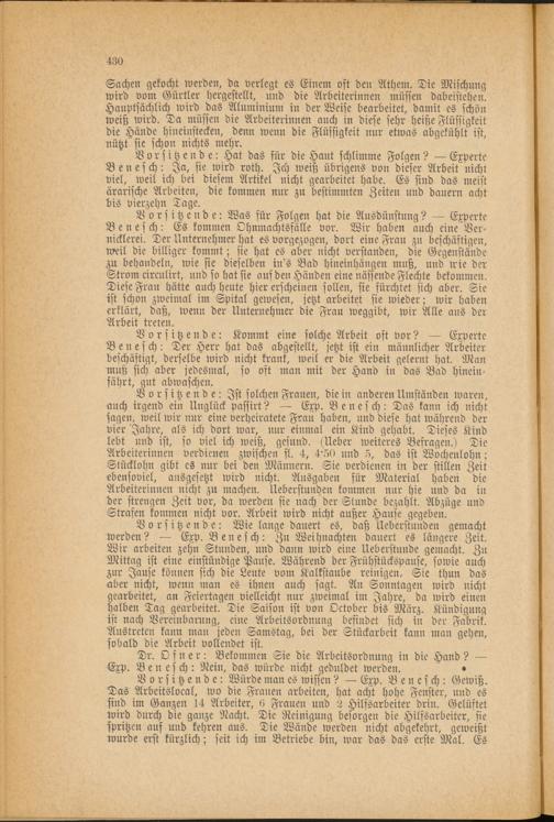 Vorsitzende: Kommt eine solche Arbeit oft vor? Experte Benesch: Der Herr hat das abgestellt, jetzt ist ein männlicher Arbeiter beschäftigt, derselbe wird nicht krank, weil er die Arbeit gelernt hat. Man muß sich aber jedesmal, so oft man mit der Hand in das Bad hinein­fährt, gut abwaschen.