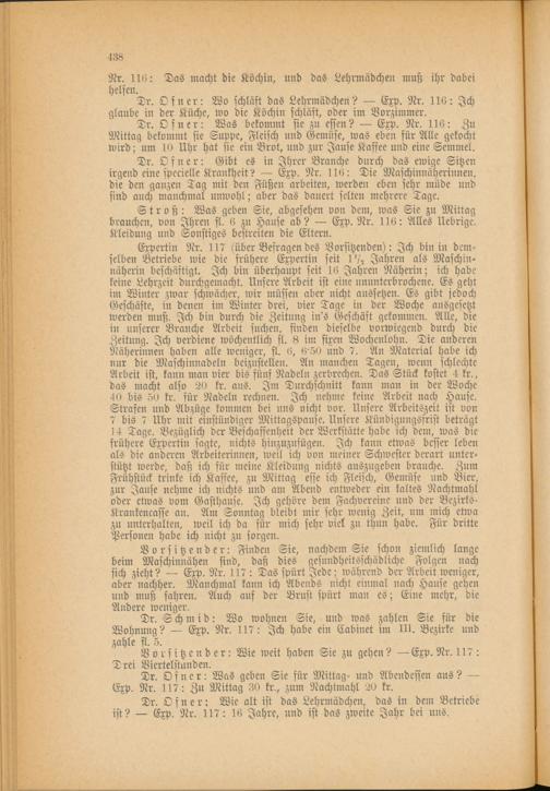 Dr. Ofner: Gibt es in Ihrer Branche durch das ewige Sitzen irgend eine specielle Krankheit? — Exp. Nr. 116: Die Maschinnäherinnen, die den ganzen Tag mit den Füßen arbeiten, werden eben sehr müde und sind auch manchmal unwohl; aber das dauert selten mehrere Tage.