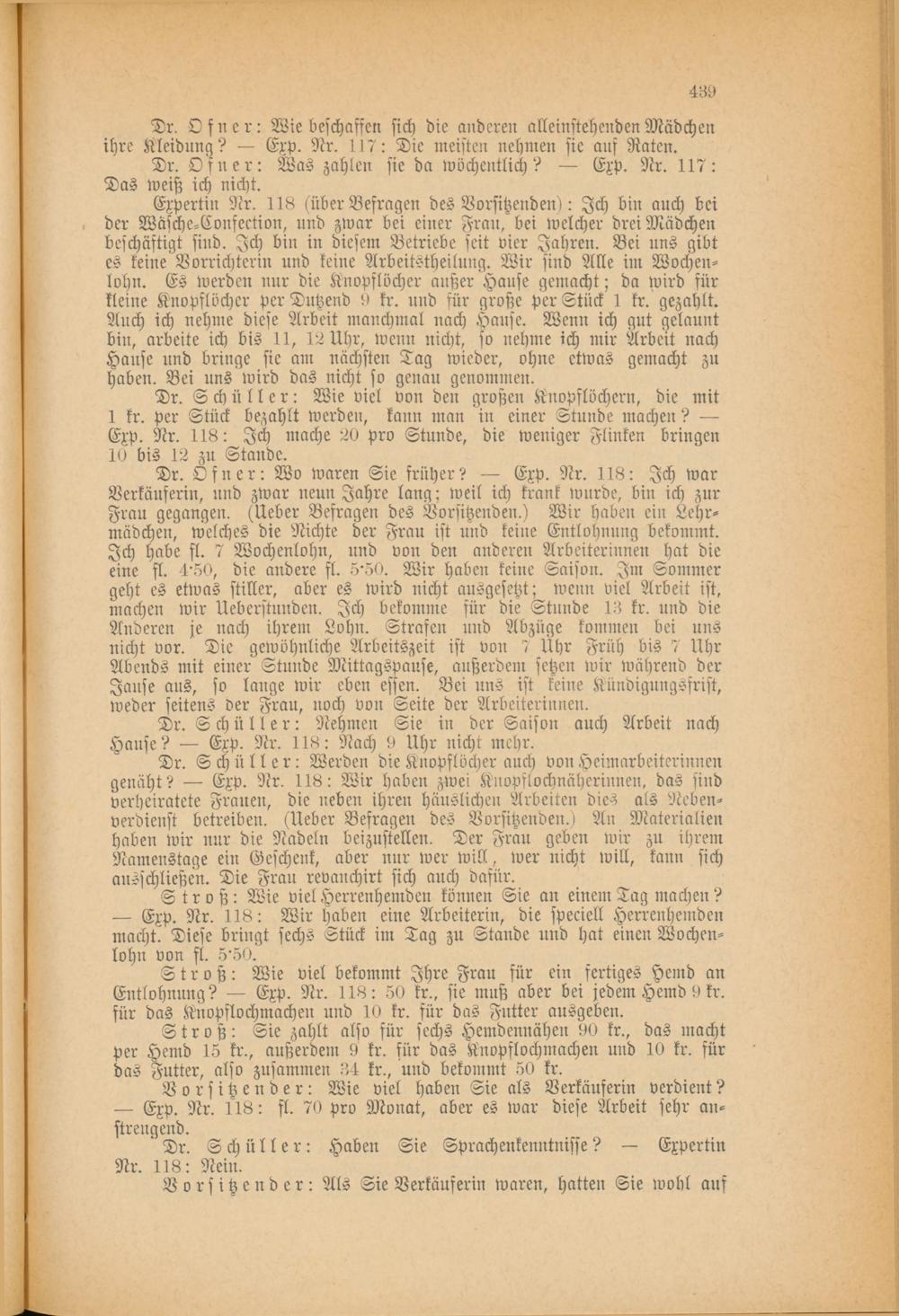 Stroß: Wie viel bekommt Ihre Frau für ein fertiges Hemd an Entlohnung? — Exp. Nr. 118: 50 kr., sie muß aber bei jedem Hemd 9 kr. für das Knopflochmachen und 10 kr. für das Futter ausgeben.