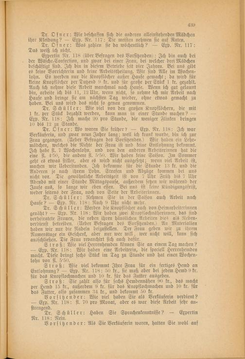 Dr. Schüller: Wie viel von den großen Knopflöchern, die mit 1 kr. per Stück bezahlt werden, kann man in einer Stunde machen? — Exp. Nr. 118: Ich mache 20 pro Stunde, die weniger Flinken bringen 10 bis 12 zu Stande.