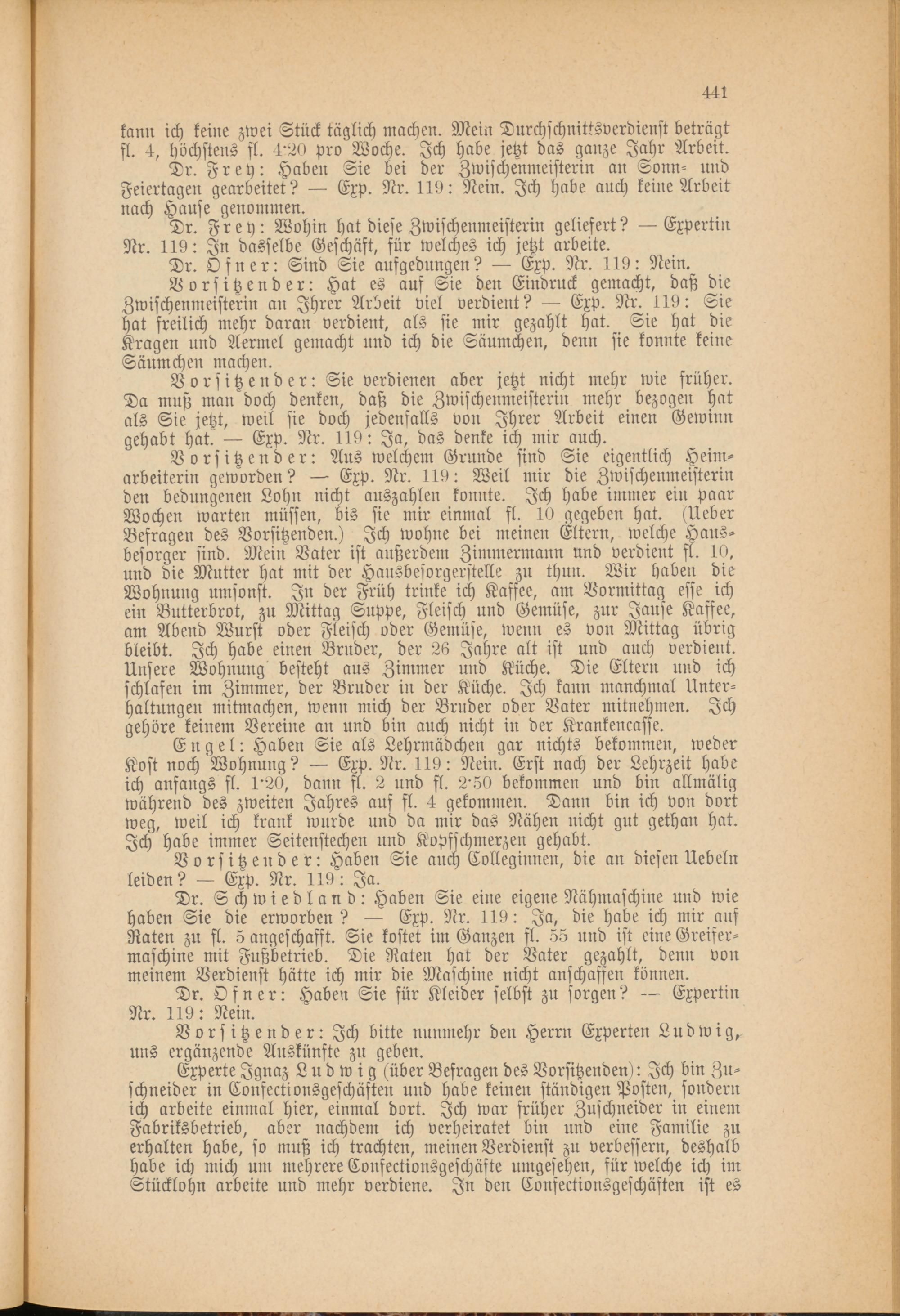 Engel: Haben Sie als Lehrmädchen gar nichts bekommen, weder Kost noch Wohnung? — Exp. Nr. 119: Nein. Erst nach der Lehrzeit habe ich anfangs fl. 1'20, dann fl. 2 und fl. 2'50 bekommen und bin allmälig während des zweiten Jahres auf fl. 4 gekommen. Dann bin ich von dort weg, weil ich krank wurde und da mir das Nähen nicht gut gethan hat. Ich habe immer Seitenstechen und Kopfschmerzen gehabt.
